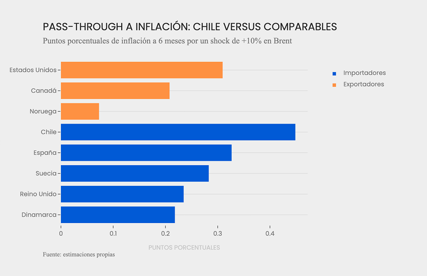 Chile no es especial en el sentido de que muchos otros países también experimentan presiones al alza en su inflación cuando suben los precios del petróleo. Sin embargo, sí es especial en la magnitud del efecto. El traspaso de precios del petróleo a la inflación, en horizontes de mediano plazo, es relativamente grande, incluso comparado con otros países importadores netos.