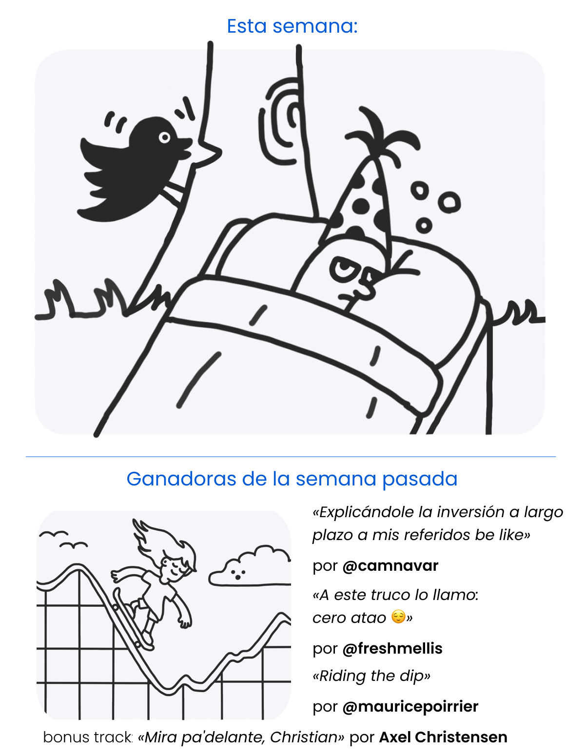 Cada semana pondremos una caricatura sin texto. Responde a este correo inventándole una frase o diálogo como bajada al dibujo. La próxima semana publicaremos las ganadoras.