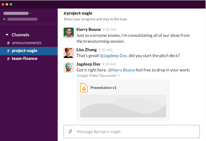 Slack es como un WhatsApp, pero para empresas. Es una plataforma de mensajería interna diseñada para el trabajo colaborativo empresarial contemporáneo. Al igual que en WhatsApp, puedes chatear 1-1 con otras personas, pero su mayor diferencia es que no puedes crear grupos. En su reemplazo existen #canales que pueden ser públicos o privados y a los cuales puedes entrar o salir cuando quieras. En cada mensaje existe la posibilidad de contestar en un hilo, como en Twitter, para mantener el foco en un tema específico y no mezclar cosas en el canal. Además, puedes enviar archivos, hacer videollamadas, e integrarte con una serie de aplicaciones externas o propias para automatizar procesos con bots.