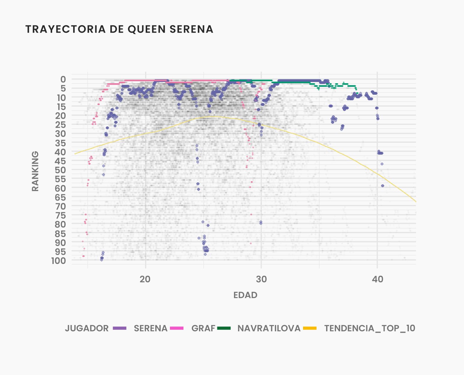Serena jugó más años después los 30 en comparación con otras leyendas y se mantuvo en puestos cercanos a la cima del tenis (Navratilova tiene puntos previos a la era del Open que no aparecen en el gráfico). Interesante también el bajón en el ranking cuando tenía 25 años, que fue reflejo de la lesión a la rodilla que la hizo pasar por el quirófano y estar fuera de los courts por 8 meses (En este gráfico no incluí hombres porque hay algunas diferencias por género en los patrones etarios de rendimiento, eso podría ser otro post).