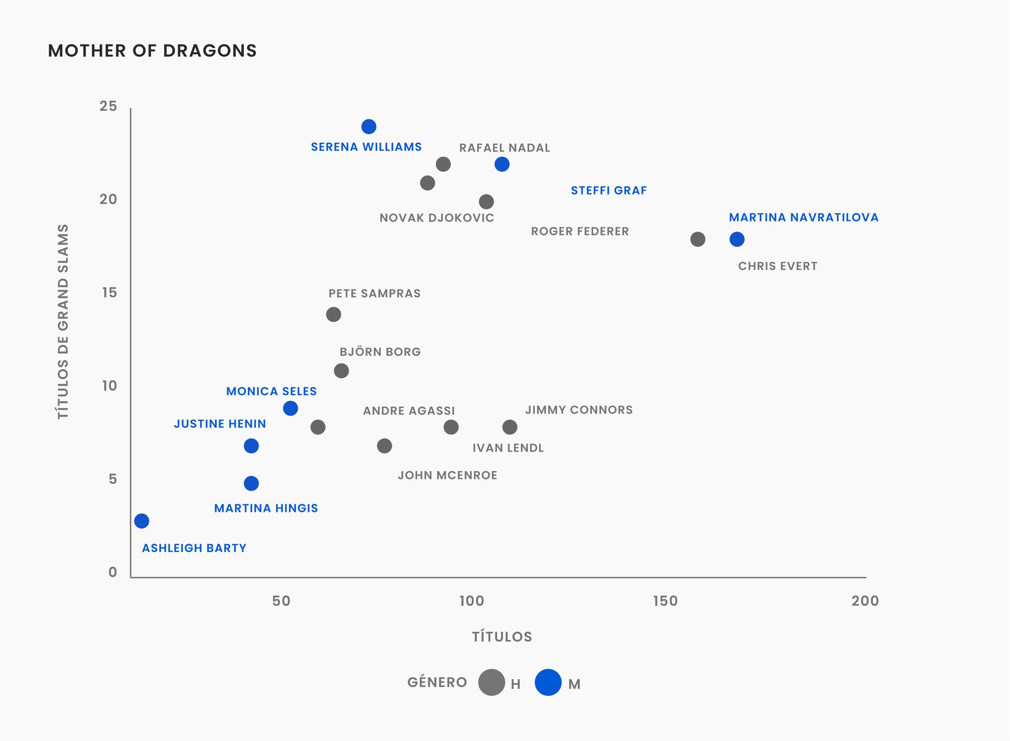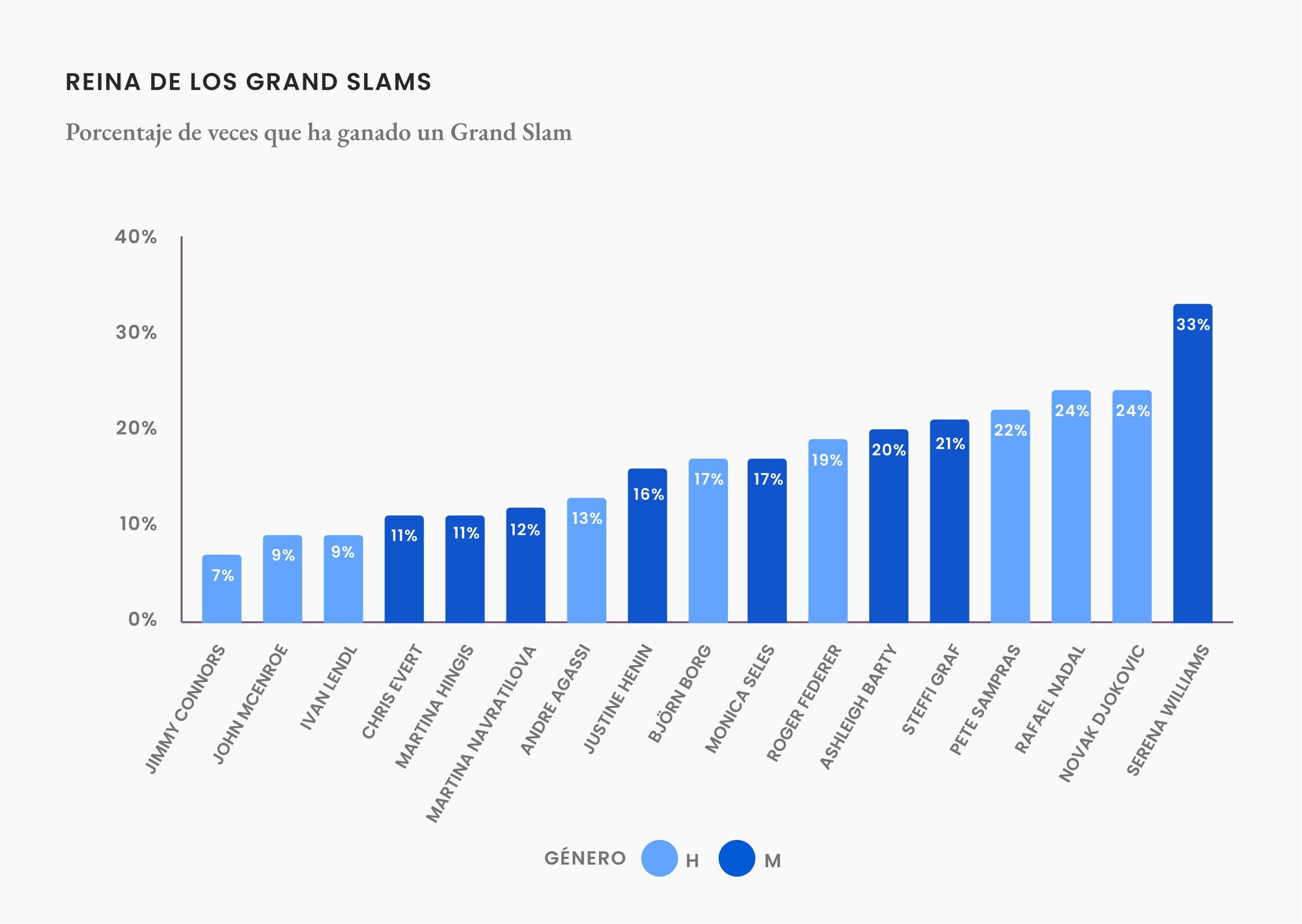 Para muchos, la manera de medir la grandeza de un tenista es la cantidad de Grand Slams que haya ganado. Estos campeonatos son más largos, tienen mayor presión y ninguno de los grandes tenistas se los quiere perder. Serena ha ganado 23 de estos torneos y se retirará con más Slams ganados que cualquier otro tenista desde que se profesionalizó el tenis (Margaret Court ganó 24 antes de la era abierta entre 1960 y 1973 y por eso no está en el gráfico), aunque con Nadal y Djokovic aún con posibilidades de igualarla.