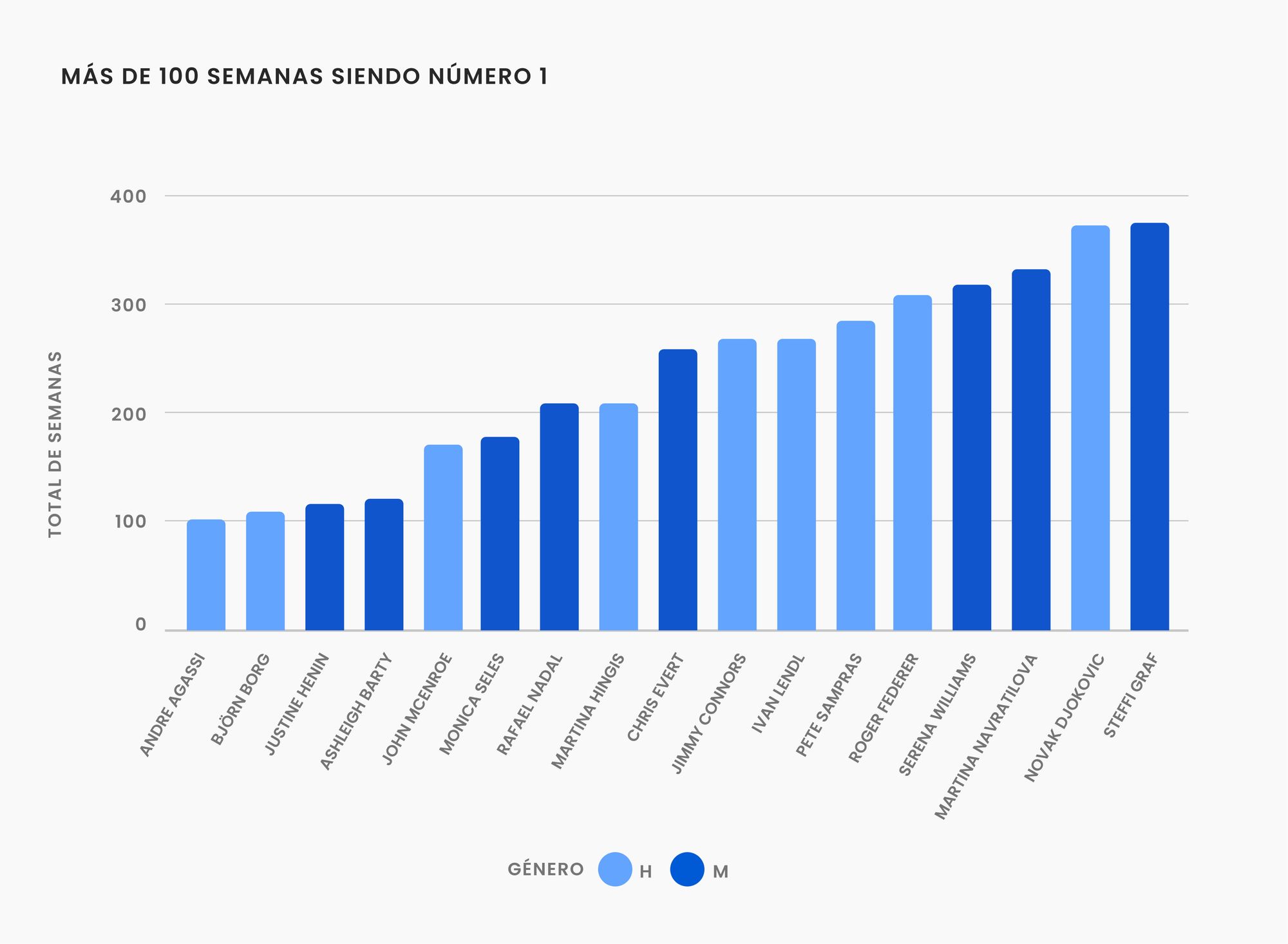 Si miramos a las y los tenistas que han estado más de 100 semanas en el número uno, Serena es el cuarto ser humano en estar más tiempo en el trono, con 319 semanas. Liderado por Steffi Graf y Novak Djokovic, Queen Serena reclama su espacio en la historia reinando por más semanas que Federer, Nadal y Sampras, por si les suena alguno de esos nombres.