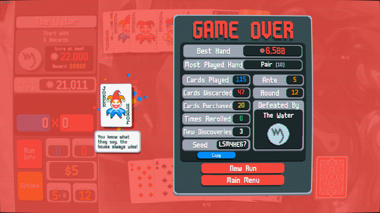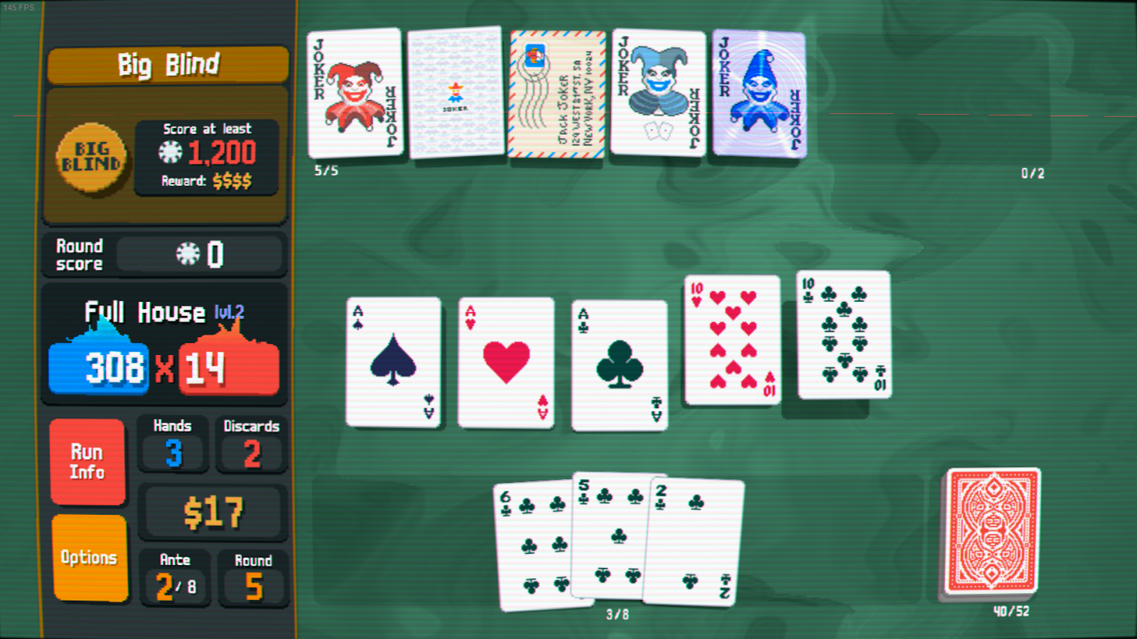 Balatro también enfrenta al jugador a otro enemigo inconmensurable: la mala suerte. A primera vista, la jugabilidad es simple: se arman manos de póker y cada tipo de mano (pares, tríos, escaleras, etc.) suma una determinada cantidad de fichas. El objetivo es superar el límite de fichas impuesto en cada ronda, y multiplicar las ganancias que el jugador puede gastar en ciertos modificadores para mejorar sus chances de ganar en cada partida. Al final de cada “ante” hay un “jefe” que modifica las reglas del juego (no se pueden usar ases, la mano debe tener 5 cartas, etc.) y el jugador debe superar este reto para seguir avanzando. También puede saltar ciertas rondas a cambio de un bono específico (dinero para gastar en la tienda, sobres de cartas gratis, y otros).