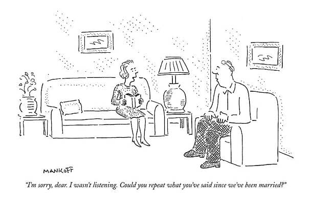 Robert Mankoff es el experto en Caption Contest. En su charla TED hace un análisis a diversas caricaturas y las razones de por qué funcionan, y habla también sobre el papel del lector y cómo este completa el chiste con su propio entendimiento del mundo, sus expectativas, su cultura. Es un trabajo conjunto entre el dibujante y el público.