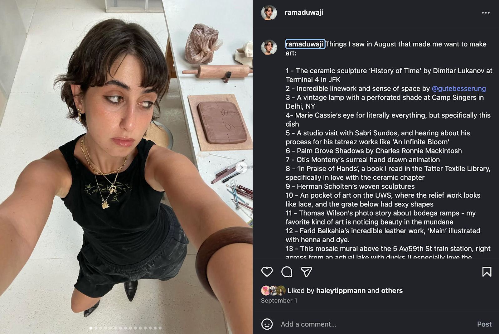 Es tentador pensar que su allure se basa en su aspecto: flaca, alta y con un rostro que parece sacado de una pintura antigua de medio oriente, pero sus posteos en instagram tienen algo más que sólo look, ya que como si de un medio editorial se tratara, hace carruseles mensuales con el caption: “Things I saw that made me want to make art”. Por más escéptica y envidiosa que me ponga con estas jóvenes taquilleras, no puedo dejar de encontrar genuina inspiración en su idea de posteo. Efectivamente, para los artistas hay ciertas cosas que nos lanzan disparados de la silla al taller; una exposición, una obra de teatro, una servilleta, un logo de auto, una señal de tráfico o un pantalón. Rama capitalizó esa sensación y mensualmente sube lo que la inspira a instagram, y eso que califica como posteable es de todo, menos su marido, Zohran Mamdani. Una chica fan en twitter (ya se ha formado un ejército de fanáticas de Duwaji), postea un pantallazo de uno de estos carruseles y dice: “Posting this two days before ur husband is elected mayor and he’s not even in it. She´s the chicest woman alive” (“Postear esto dos días antes de que a tu marido lo elijan como alcalde y él ni siquiera aparece. Es la mujer más chic del momento”).