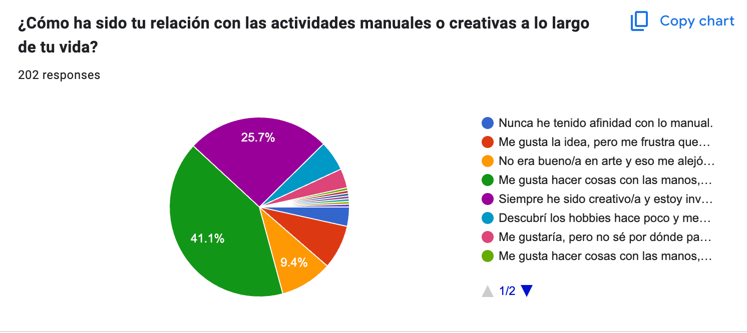 A los 25, entonces, se produciría (según mi hipótesis) una vuelta a la infancia resignificada, un volver a mirar lo que fuimos sin el cringe de la adolescencia, sino con ternura y honestidad. Es ahí donde nos encontramos con el hobbie, que en muchos casos es una reinterpretación de una actividad de cuando éramos niños. Y los resultados de la encuesta hablan de un interés por las manualidades, donde un 41,1% contestó que le gusta hacer cosas con las manos, pero no siempre puede, y un 25% dijo que siempre ha sido creativo/a y está inventando cosas.