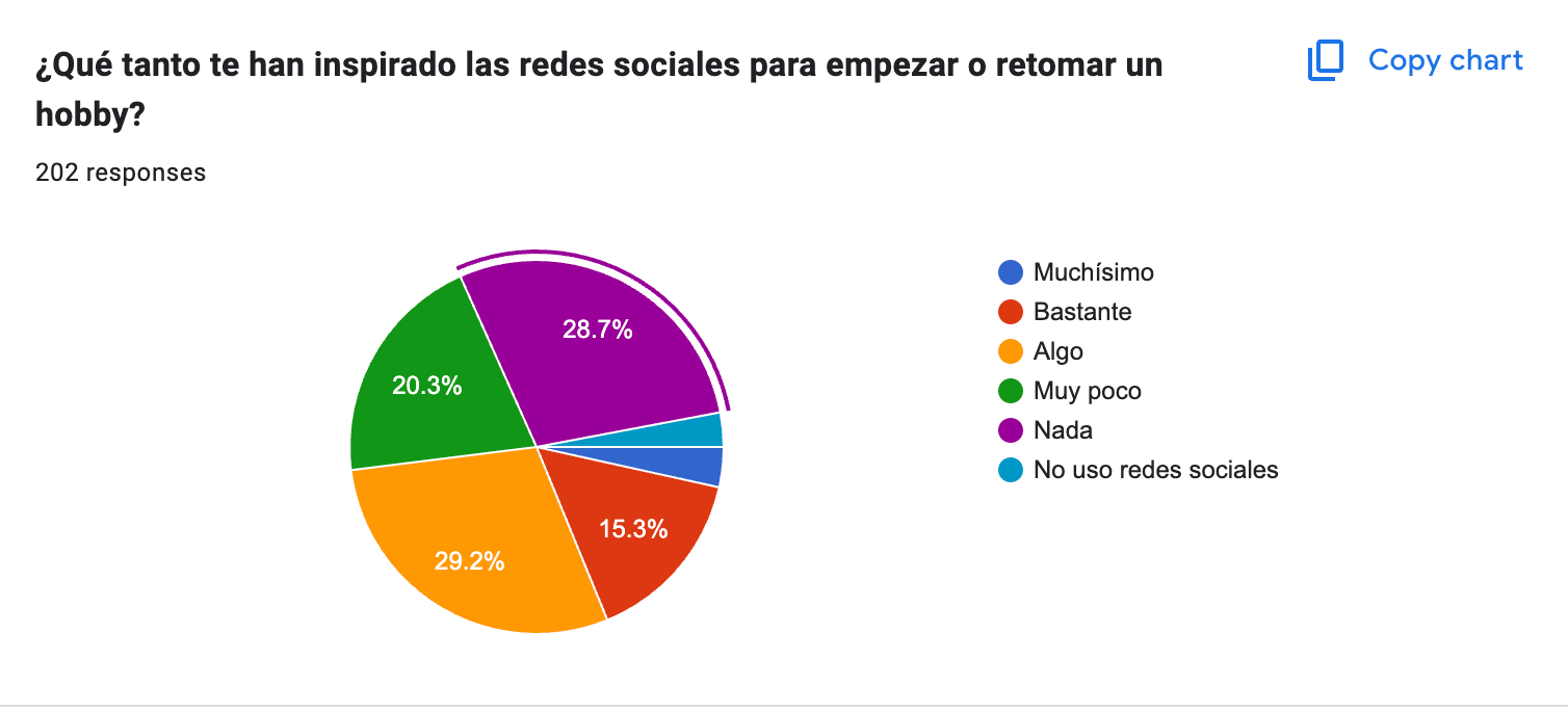 Y algo que me sorprendió fue que un 28,7%, la segunda mayoría, dijo no sentir NADA de inspiración en redes sociales para empezar o retomar un hobbie. La primera mayoría dijo, con un 29,2%, que las redes sociales lo había inspirado “algo” pero con la cantidad de tiempo que pasamos en redes sociales hubiera apostado a que al menos el 50% declarara que sí, que en efecto se inspiran mucho en Instagram o Tiktok.