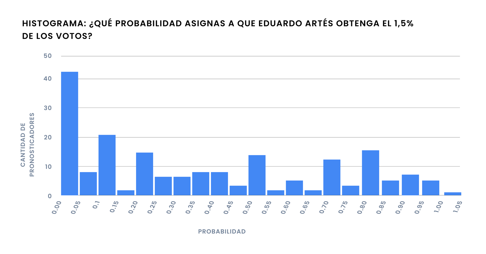 Aunque el pronóstico más recurrente de nuestros concursantes es 0% de probabilidad de que Artés obtenga al menos 1,5% de los votos en primera vuelta, el promedio de las probabilidades fue de 43%. Además, la mediana de los pronósticos –el valor que divide en la mitad los datos– se situó en 366%. Llama la atención, eso sí, que hay varios pronosticadores que le asignaron un 70% de probabilidad o más a que el Profesor obtenga 1,5% de las preferencias por lo bajo.