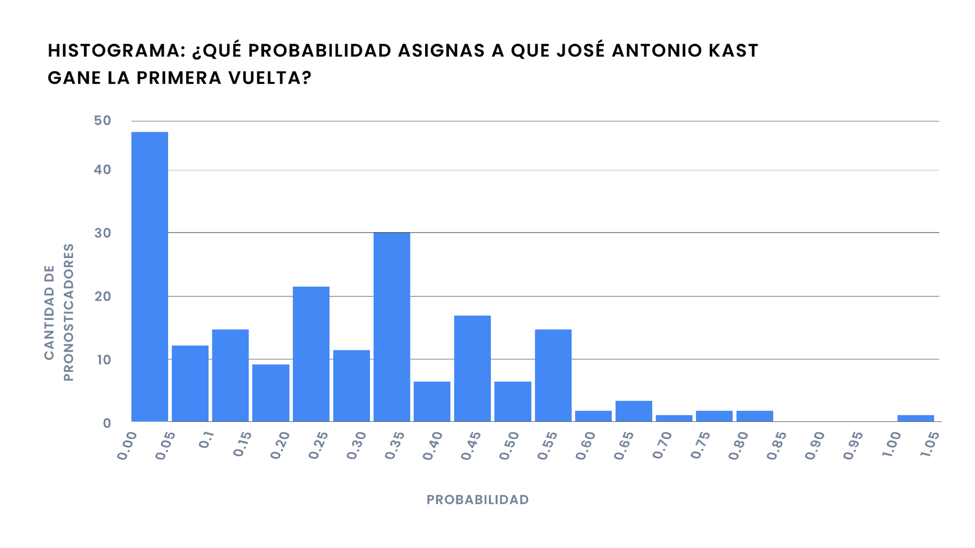 La mitad de los datos se concentra por debajo del 21% (la mediana de la distribución) y el promedio de las probabilidades es de 25%. Además, 36 participantes le asignaron un 0% de posibilidades de ganar en la primera vuelta, que es el valor más frecuente (moda).