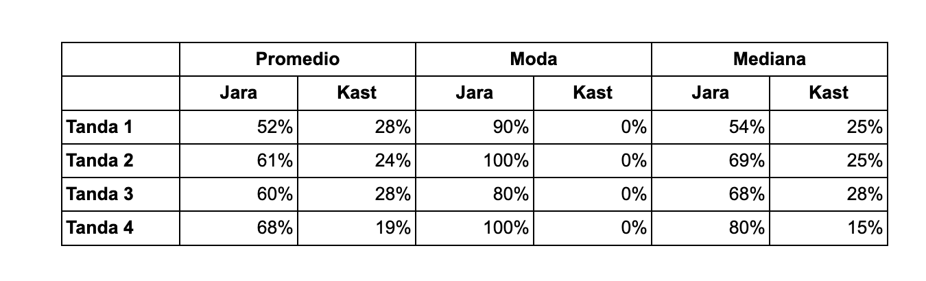 Aquí la cosa se pone más interesante. A medida que han pasado las semanas del torneo de superpronosticadores, los concursantes le dan chances más altas a Jara, al mismo tiempo que reducen las probabilidades percibidas de la victoria de Kast. La tabla a continuación muestra la evolución de los promedios, medianas y modas de las distribuciones de probabilidades que se la han dado a uno y a otra.