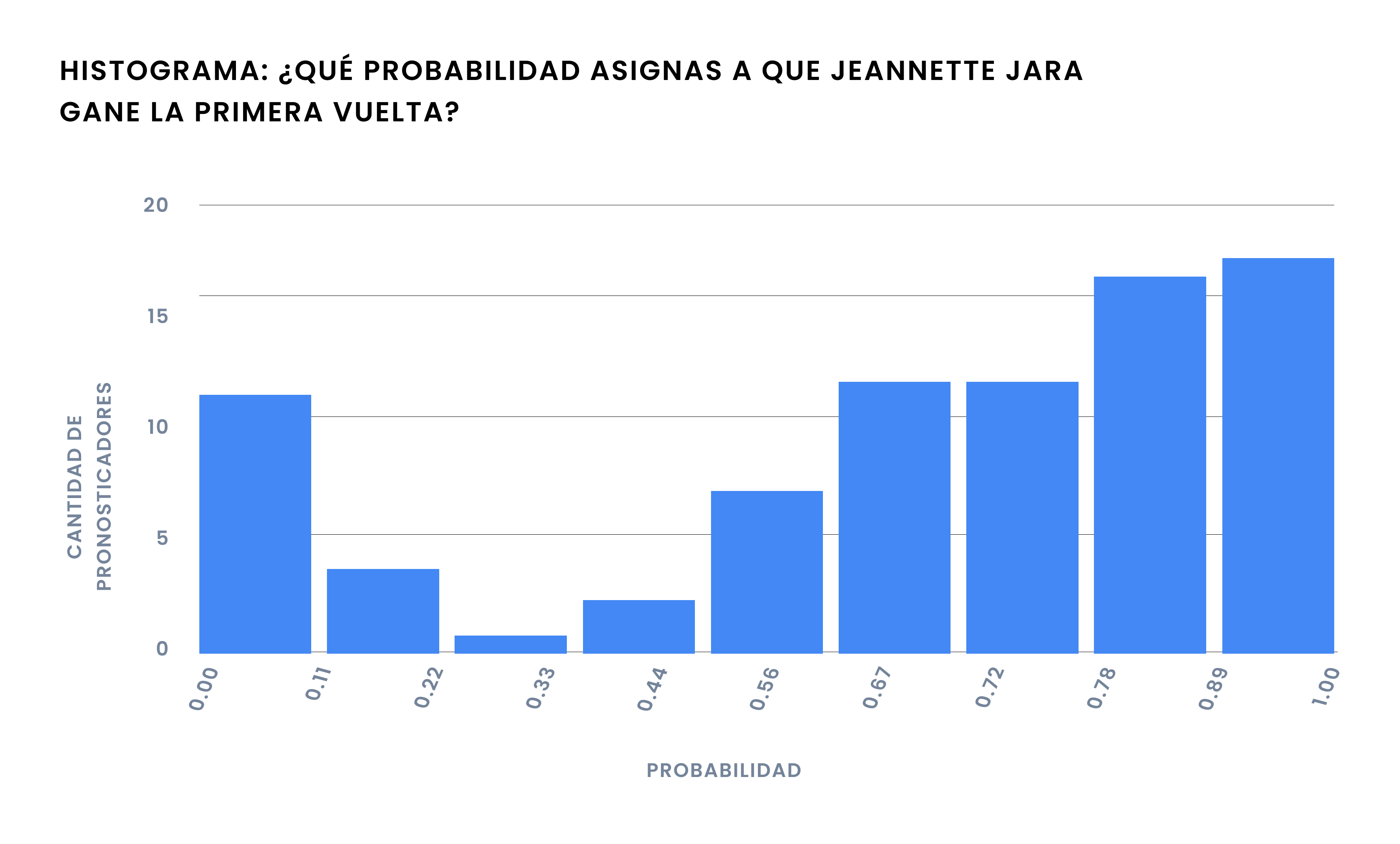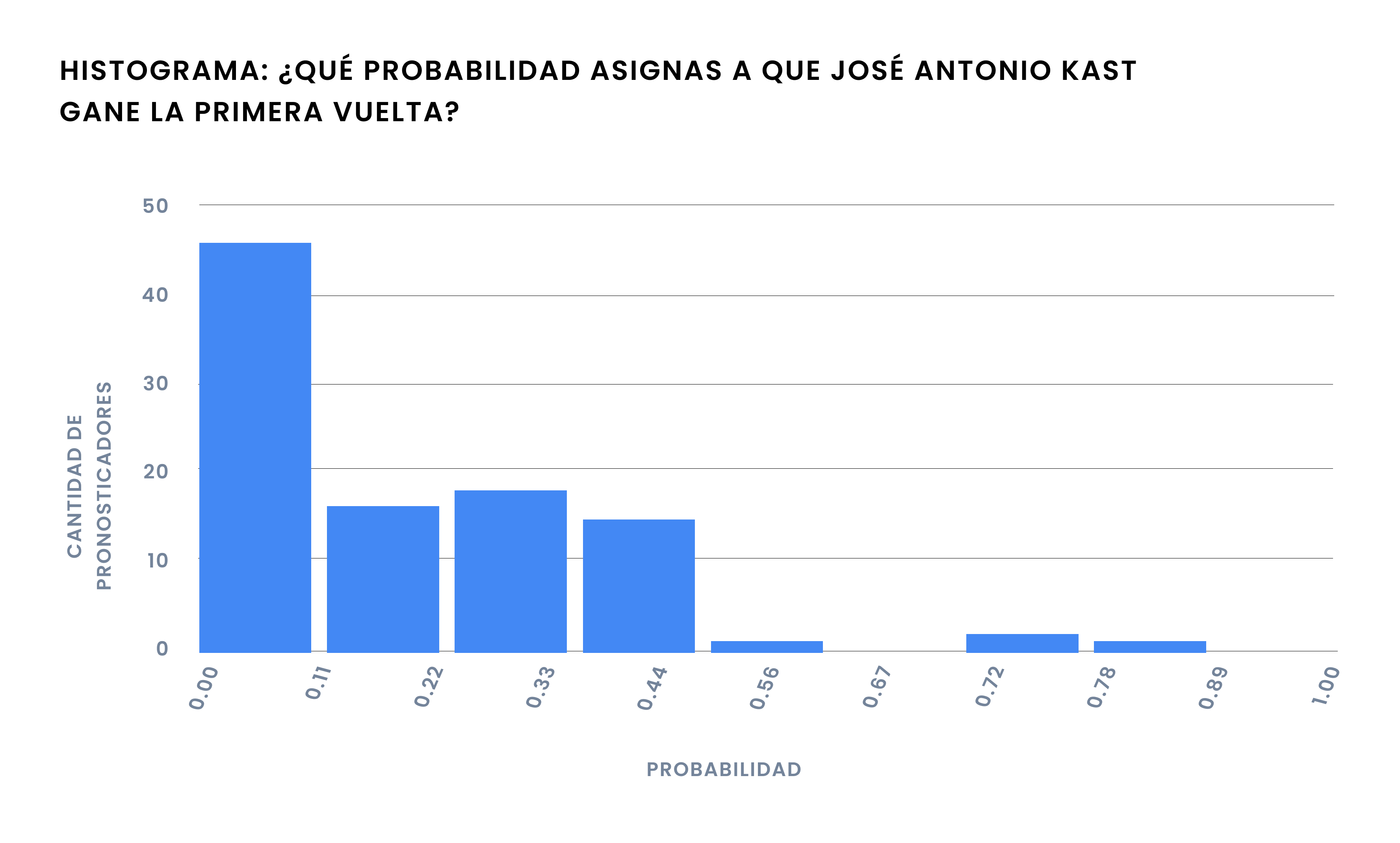 Las medianas se condicen con esto: en el caso de Kast, las predicciones han tendido a concentrarse en las probabilidades bajas (su mediana actual de probabilidades es de 15%), mientras la mitad de las predicciones de Jara se ubicaron por sobre el 80% en la última semana.