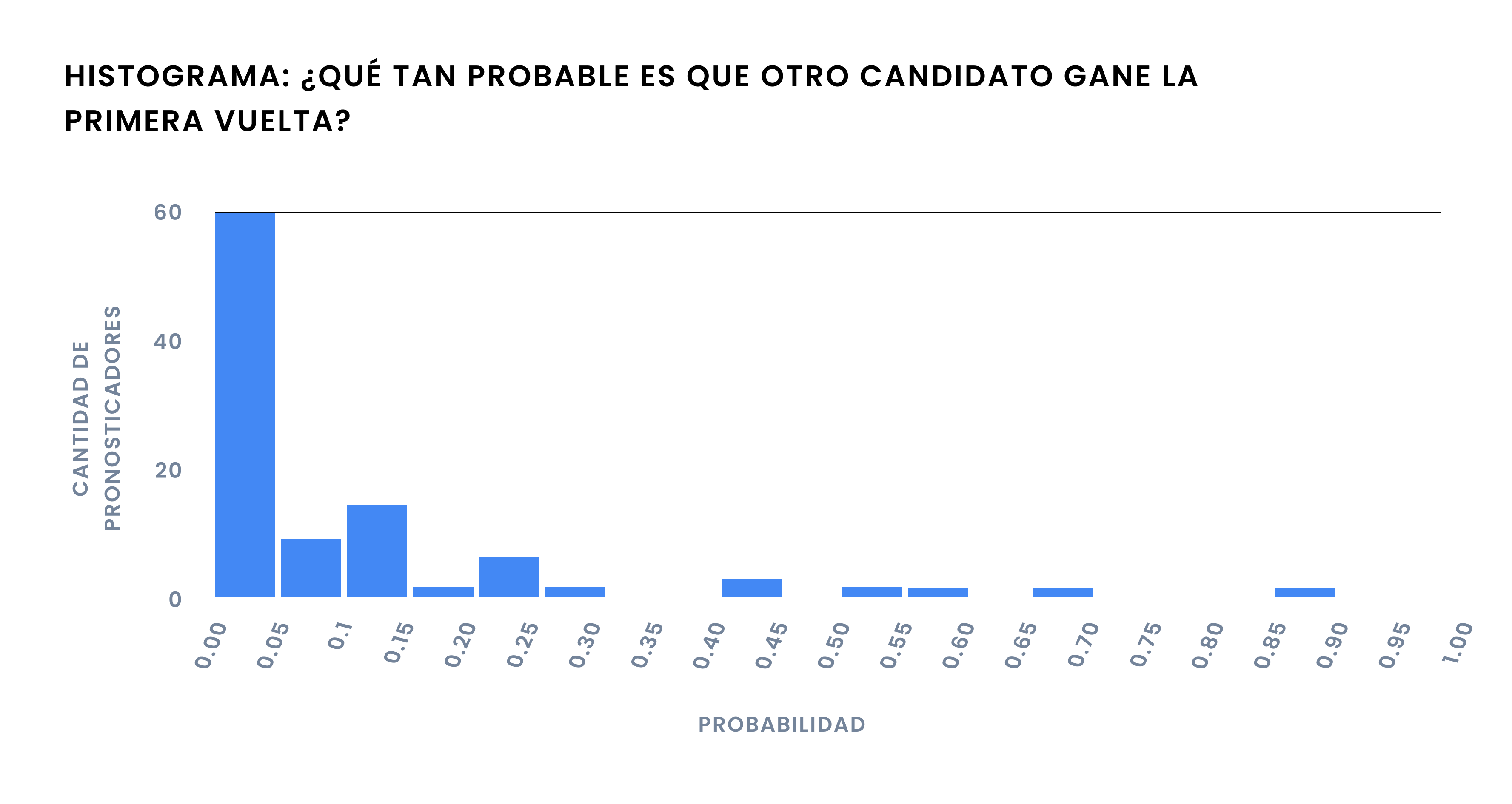 En general, los concursantes ven altamente improbable que otra candidatura gane la primera vuelta, y esa percepción se ha afirmado en el tiempo. Por ejemplo, si la primera semana del concurso la media de probabilidades era de 14%, esta cuarta semana la media fue de 8% de posibilidades que un tercero gane la primera vuelta.
