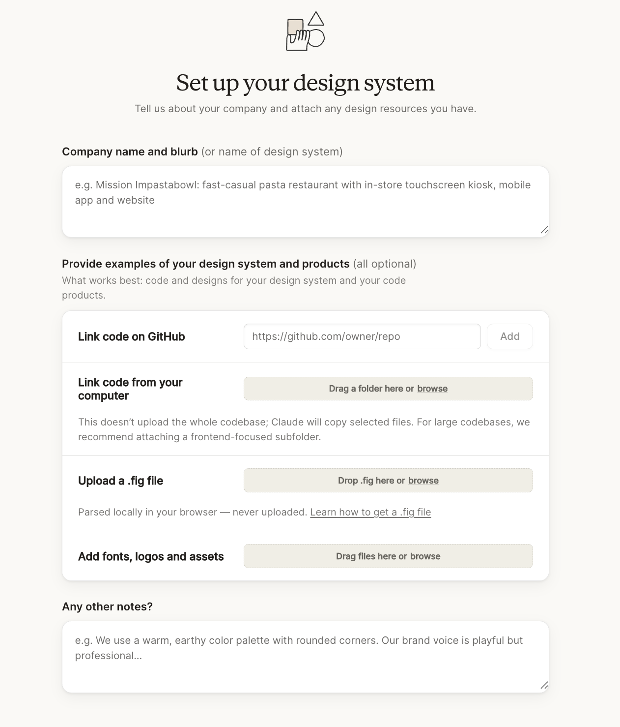 Si tienes un design system (DS) bien documentado, es muy fácil subirlo para que lo uses como contexto. Te da opciones de conectarse con GitHub, subir archivos de Figma y hasta explorar páginas web para que Claude Design capture esa información como referencia.