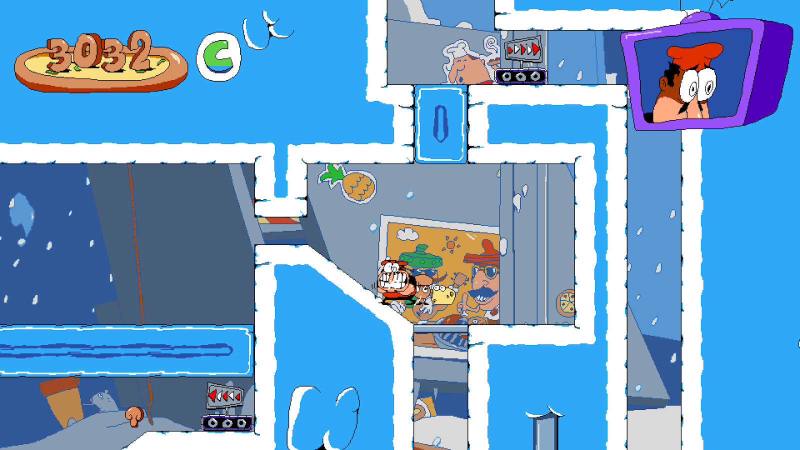 Al final de los niveles se asigna un rango acorde a su desempeño, siendo el máximo el rango P (de Pizza o Perfect, como el lector desee). Esto se logra superando el nivel, habitaciones secretas y objeto incluido, sin perder el combo y completando la sección final dos veces en lo que el juego denomina “Lap 2”. No es obligatorio realizar esta hazaña, y menos en todos los niveles (jefes incluidos), pero es aquí donde Pizza Tower logra destacarse aún más. Mi tiempo de juego se ha duplicado a causa de la adrenalina que provoca este desafío y al nivel de maestría que requiere, quizás similar a aprender un combo en un juego de pelea o una canción en un juego de ritmo. No hay una gran recompensa al final, pero la jugabilidad por sí misma es satisfactoria.