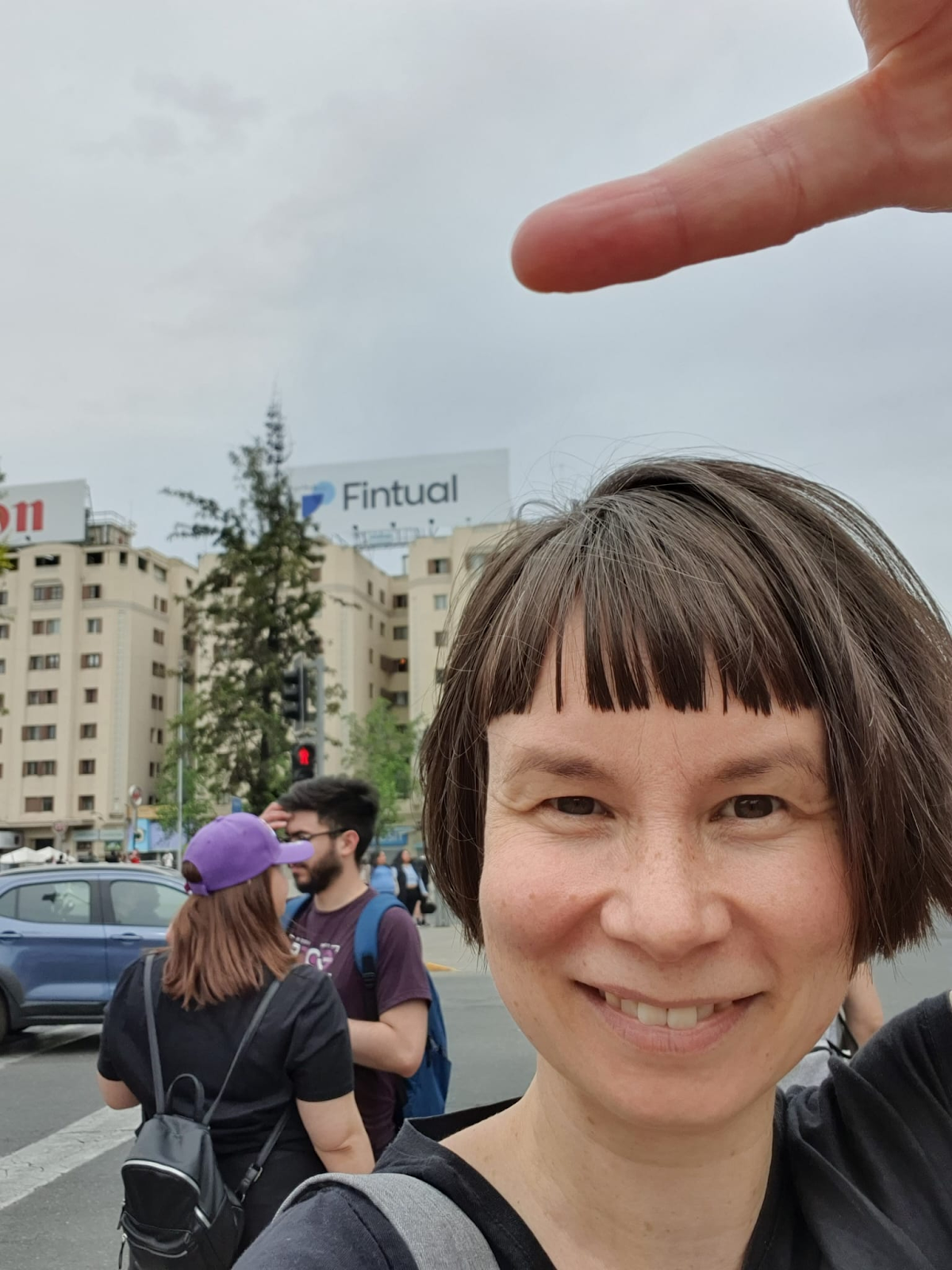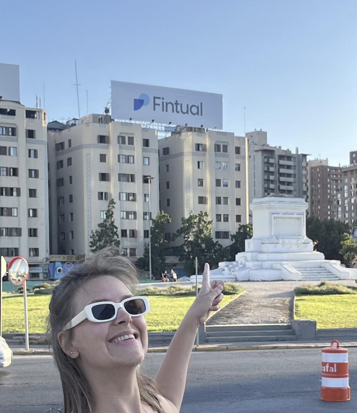 Turistas europeas haciéndose una selfie con el letrero de Fintual en los Edificios Turri.