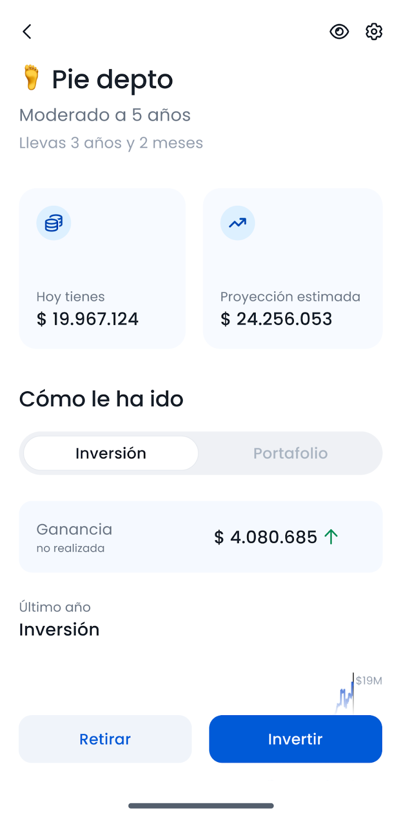 Al crear cada inversión hacemos una simulación inicial que –hasta ahora– se perdía y no acompañaba la inversión en el tiempo. Esto hacía que se perdiera el contexto y perspectiva del plan original de cada cliente. Por eso, el primer cambio es traer esa proyección actualizada a la visualización, para así ayudar a entender qué pueden esperar de cada inversión según sus metas.