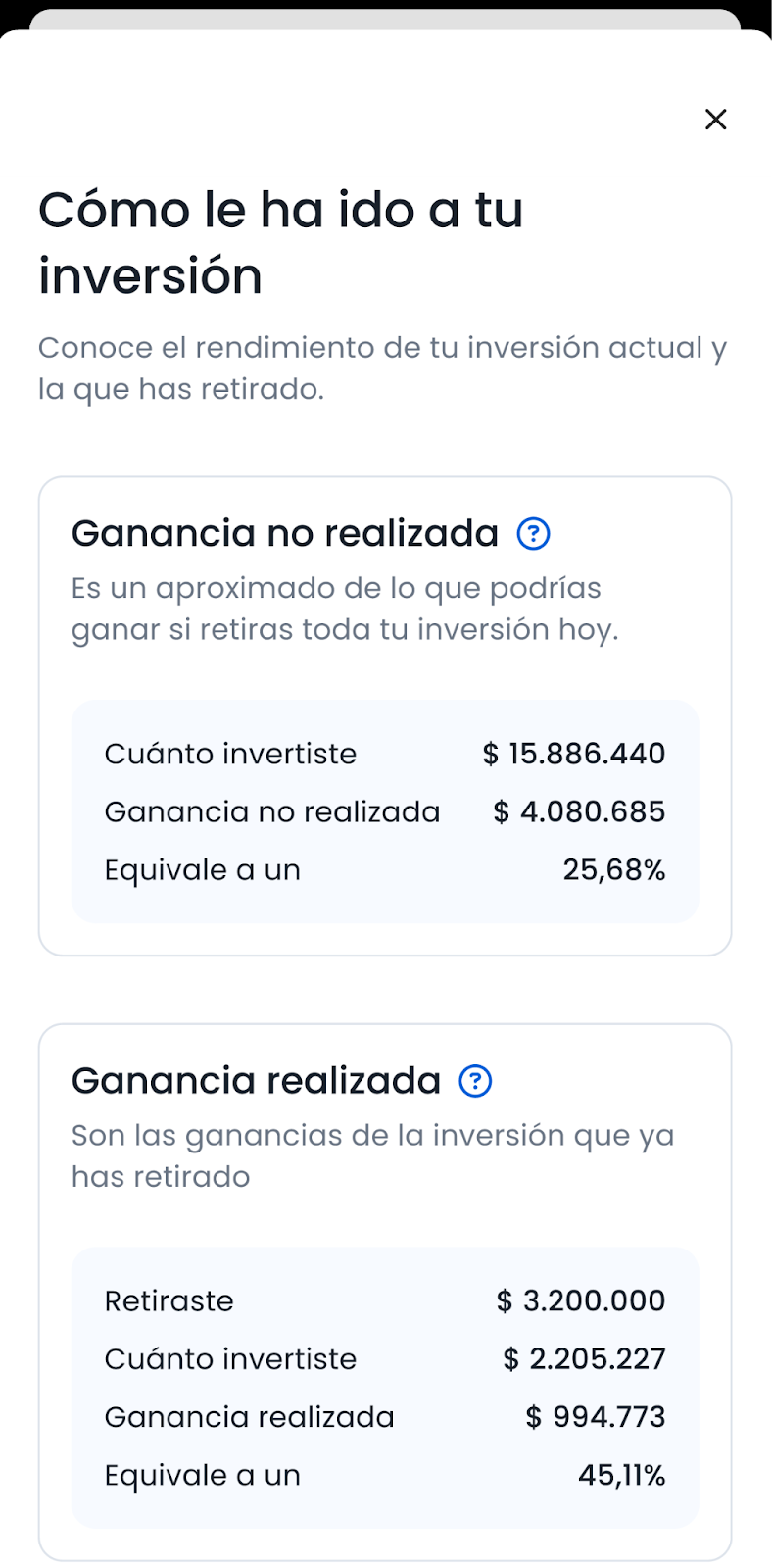 Hay varias formas de calcular la rentabilidad cuando haces varios depósitos en el tiempo, por lo que decidimos hacer lo mismo que hacemos con las Acciones y ETFs: desglosar la variación entre ganancia no realizada y realizada. En simple, permite separar la rentabilidad que tuvo la plata que ya se haya retirado de la rentabilidad de la plata que sigue invertida, resolviendo la necesidad de "resetear la inversión.