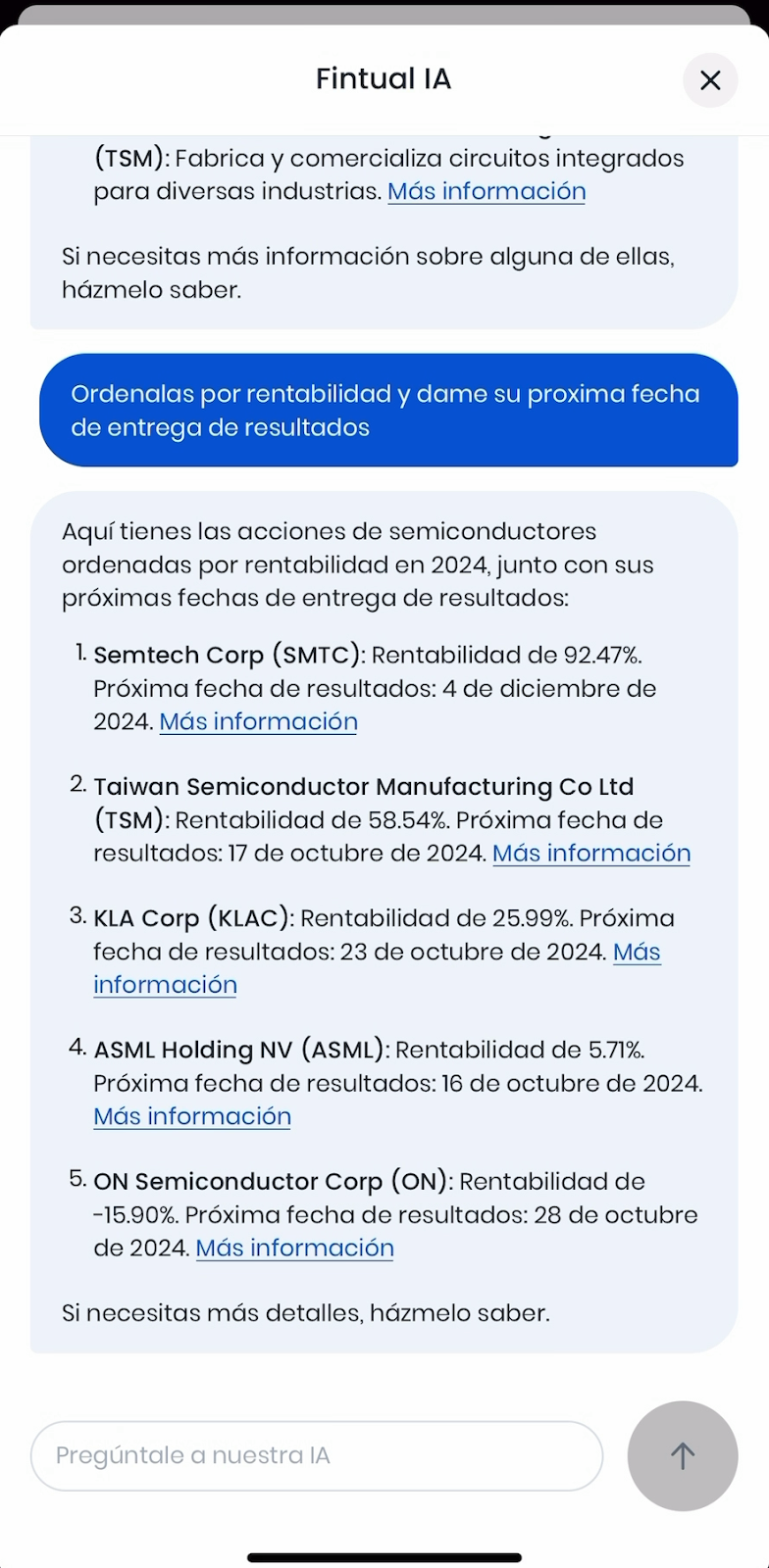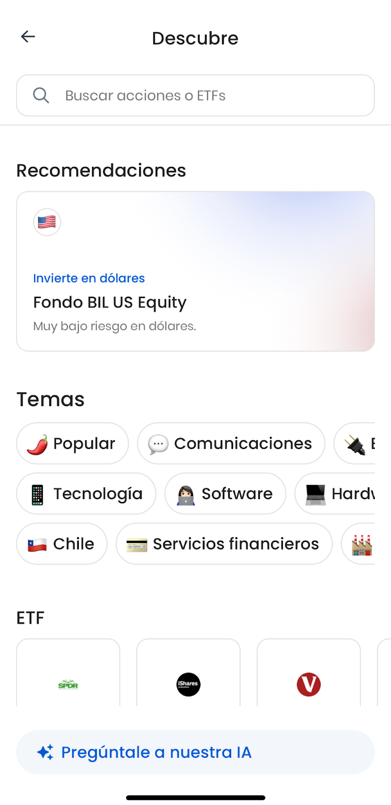 2. Comunicación. Un chat con un agente de Fintual IA experto en acciones que permite búsquedas avanzadas con filtros y métricas en el navegador de acciones.