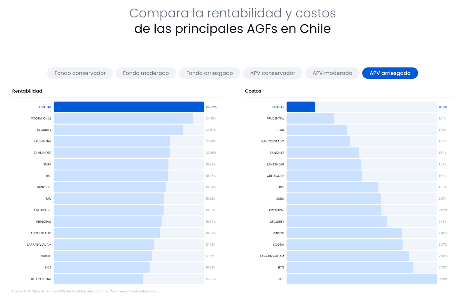 Y como tip, hay una forma que no muchos conocen: puedes traer tus inversiones desde otras instituciones sin costo. Esto importa harto, porque en el largo plazo, diferencias en costos y rentabilidad pueden tener un impacto importante en tu patrimonio. De hecho, al compararnos con la industria, estamos dentro de los primeros lugares en rentabilidad y también entre los más bajos en costos (y en muchas categorías como APV, somos número 1).