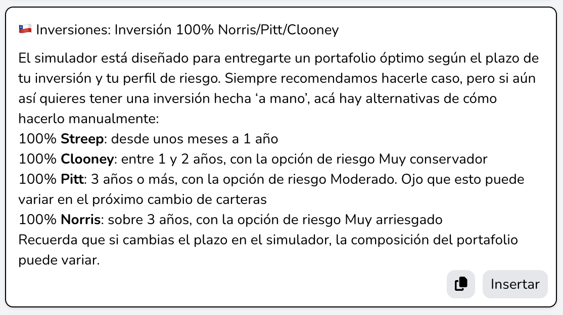 Esto es algo que rondaba nuestra cabeza hace años. De hecho, teníamos una saved reply (respuestas pre-hechas para contestar el chat) para cuando los clientes preguntaban cómo crear una inversión con un portafolio elegido por ellos (normalmente 100% de alguno de nuestros fondos). Revisé y la hemos usado en más de 1.000 conversaciones.
