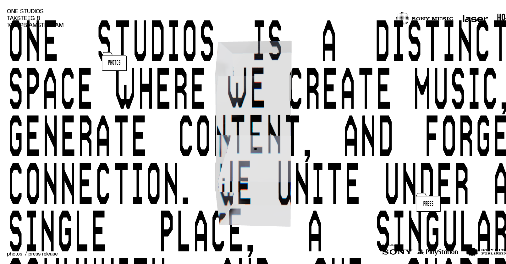 Fondo negro, fotometria, points cloud, control de la navegación con el rostro (webcam + IA) y glitches con shaders y movimientos de la mano.