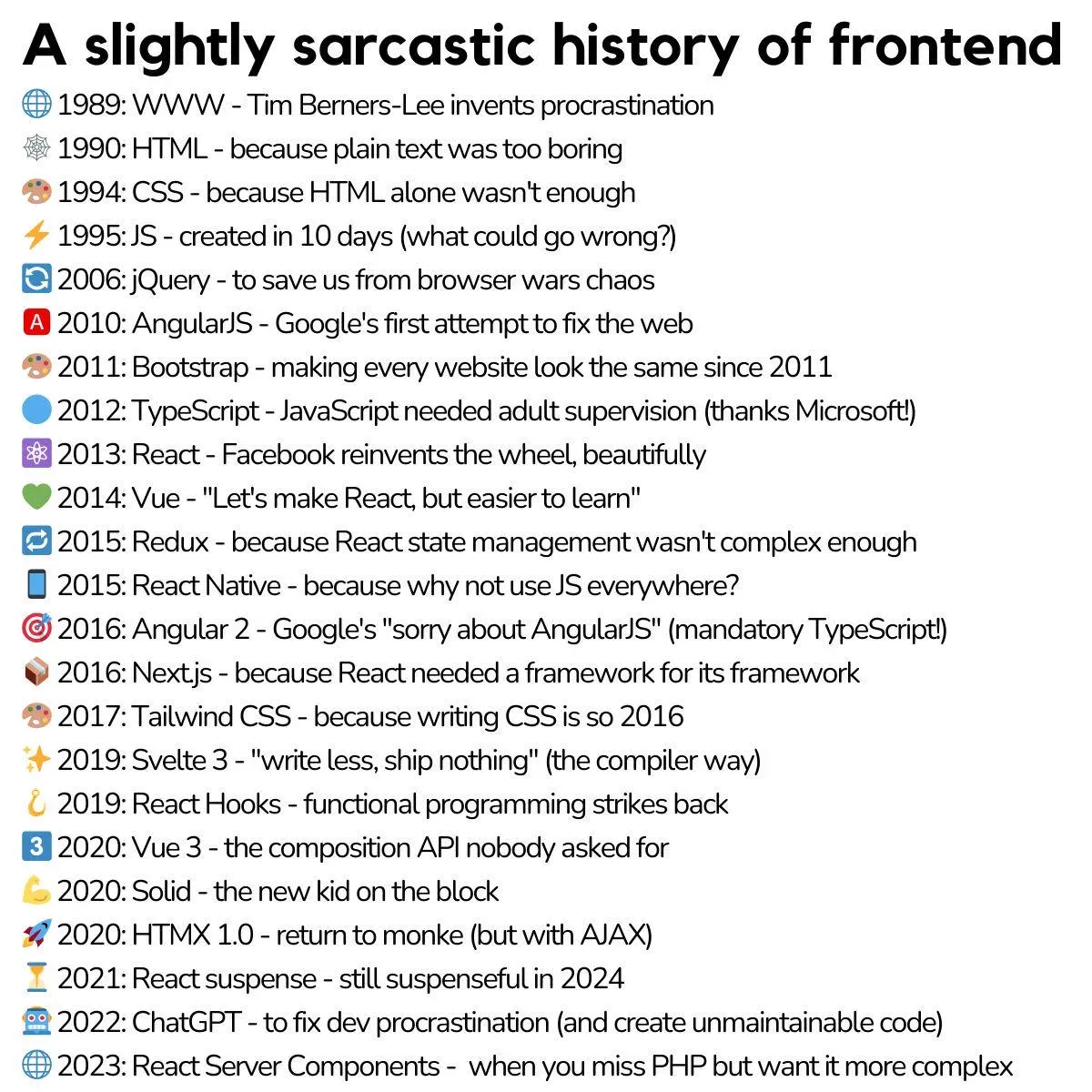 En 2025, incluso teniendo tecnologías avanzadas como React, Next.js, TypeScript, etc., lo que se renderiza en el navegador no cambia mucho. Todo el "hype" de frameworks y librerías modernas se concentra en una capa de abstracción para organizar mejor el código y hacer más eficiente el desarrollo y el rendimiento, pero lo que se entrega al cliente es la misma base de siempre: