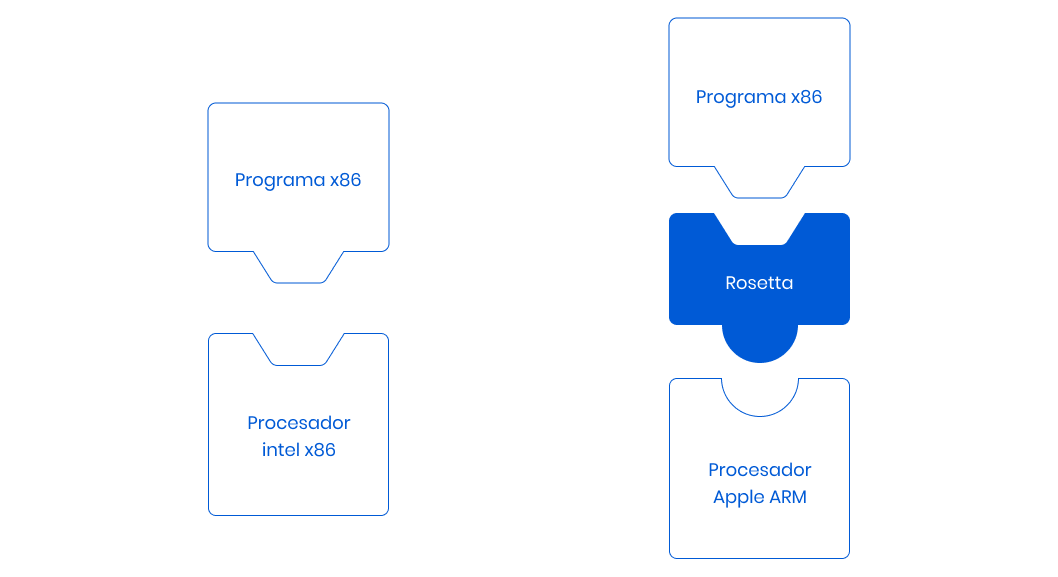 ¿Te acuerdas de que hablamos del procesador como un traductor? En un cambio de arquitectura, hay un cambio completo de lenguaje, por lo que si la transición sale mal, no podrías abrir la mitad de tus programas. Es como si la vieja arquitectura de procesadores que usa Intel (x86) tradujera de español a francés. Ahora con el cambio a ARM (Apple Silicon) los procesadores traducen de inglés a francés. Por un lado, es muy bueno, porque el inglés es más eficiente, porque tiene menos artículos por ejemplo. Pero por otro lado, todos los programas que estaban escritos en español deben ser traducidos primero al inglés para luego ser traducidos al francés. Desde que se anunció Apple Silicon en junio, desarrolladores de todo el mundo, como Microsoft y Adobe, han estado “traduciendo” sus Apps para funcionar correctamente con la nueva arquitectura. Y para todos los programas que aún no han sido optimizados, Apple desarrolló un módulo llamado Rosetta, que lee programas de la vieja arquitectura y los traduce a la nueva sin que el usuario lo note. Algo así: