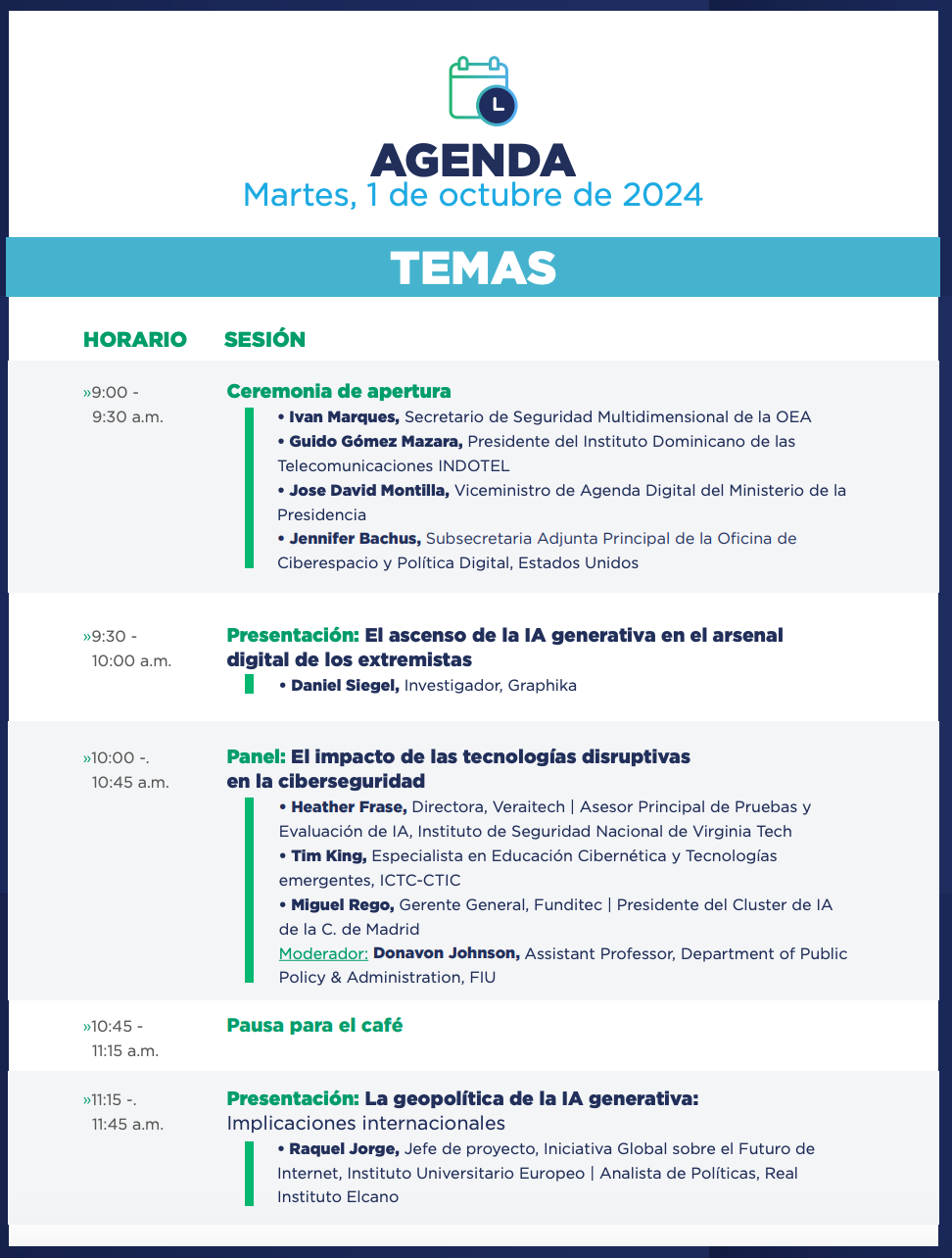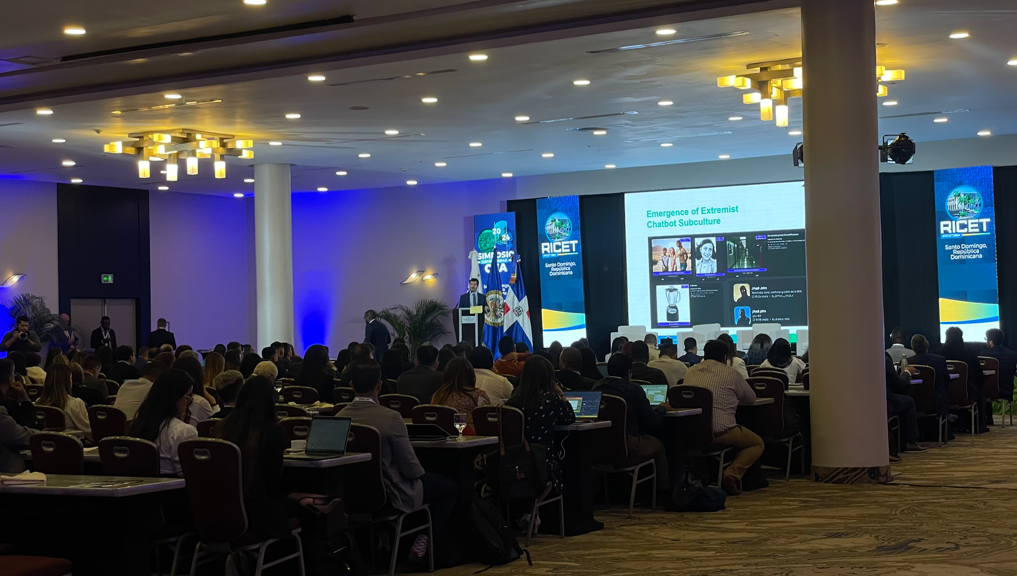 El simposio eran dos días llenos de charlas muy interesantes, más un tercer día dedicado a RICET, una iniciativa de educación y entrenamiento en ciberseguridad en América y el Caribe. El primer día partió con la presentación del evento y de inmediato comenzó una charla buenísima sobre el uso indebido de la inteligencia artificial generativa por parte de atacantes y organizaciones terroristas, recalcando la importancia de crear plataformas seguras y prevenir el abuso de los nuevos modelos de inteligencia artificial.