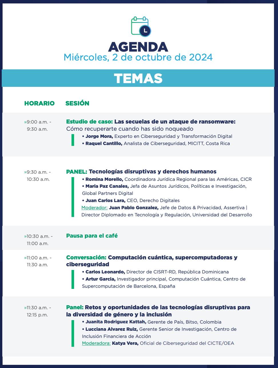 También se habló del uso de los datos y tecnologías disruptivas desde el punto de vista de los derechos humanos. Se discutió del mal uso de los datos y de que las organizaciones tienen el deber de usarlos responsablemente, en particular si estos pasan por modelos de inteligencia artificial para tomar decisiones que afectan nuestras vidas de manera automatizada. Los modelos de inteligencia artificial siempre deben ser usados como guía y las decisiones las deben tomar personas, sin confiar en exceso en los modelos, siendo responsables cuando algo salga mal y cuidando la integridad de las personas.