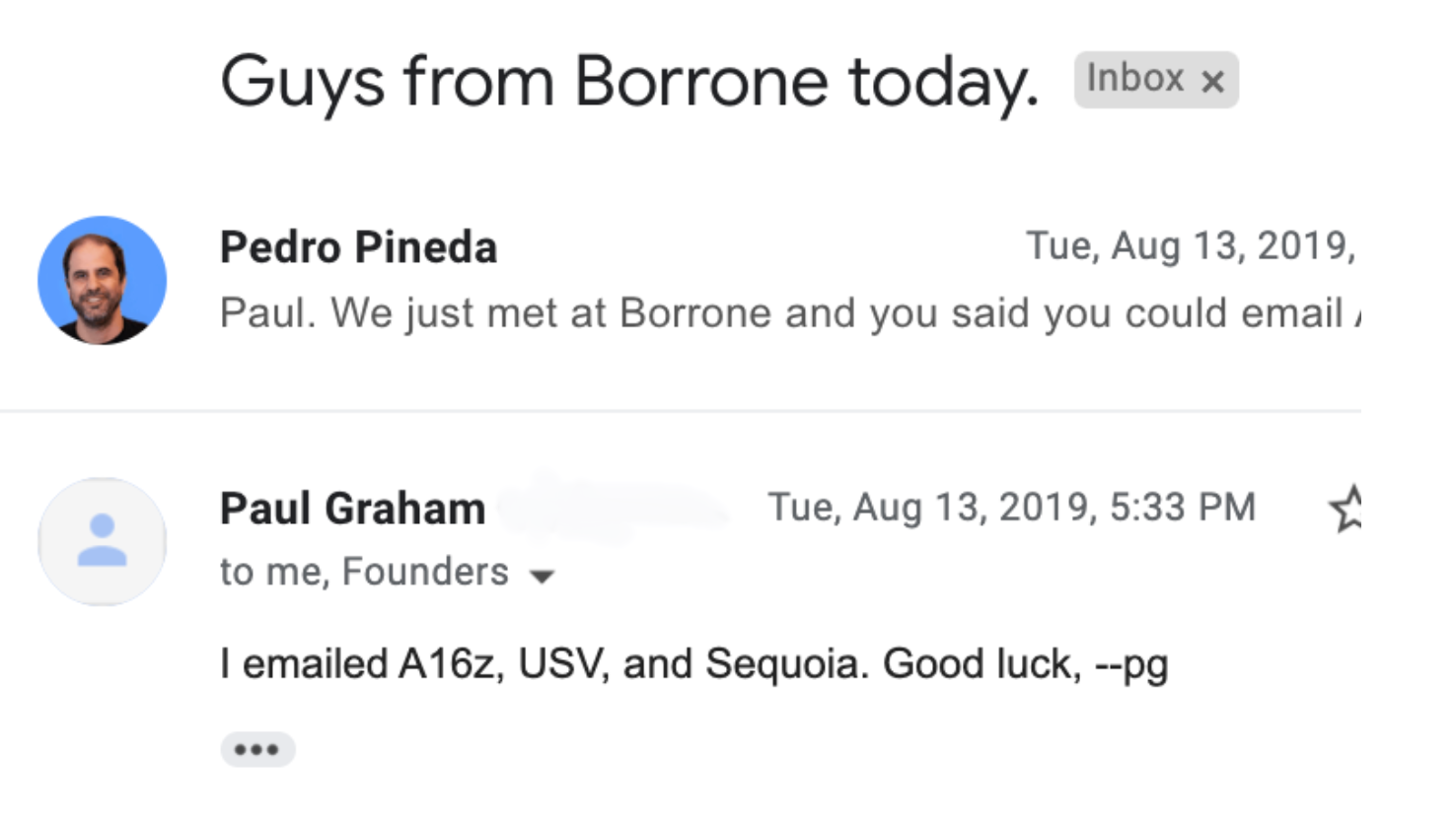 No podía pensar en nada más. “Quedan segundos Agustín, haz algo ahora”. Mis socios parecían más relajados y empezaban una conversa y yo “No podemos perdernos esto wn!” — “Cierto pos. Bueno dale, te sigo” dijo Pedro. Me paré y caminamos hacia la mesa donde estaba Paul. Cuando vamos como a 5 metros, cierra el libro y lo pone en la mesa, timing perfecto. “Hey Paul, we’re on the 2018 summer batch of YC” — “Sure guys, take a seat!” Superó todas mis expectativas. Nos preguntó por nuestro negocio. Se entusiasmó con nuestro crecimiento. Nos aleonó y ayudó a entender cómo hablar con los inversionistas de Silicon Valley. Al final de la conversación dijo que le escribiéramos un email porque nos haría una intro con Sequoia. Dicho y hecho.
