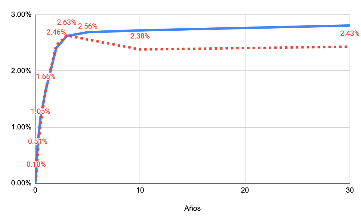 Ahora ¿qué pasó el 1 de abril? O ¿cómo se vio la curva ese día?; en el siguiente gráfico (con línea roja) podemos ver la inversión que existió y cómo a partir de los 3 años los rendimientos disminuyen, y como esta varía desde la actual (línea azul).