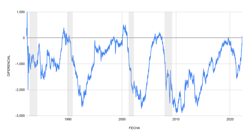 Para obtener una perspectiva histórica, evaluamos la relación existente entre la tasa de 2 años y la tasa de 10 años durante los últimos 40 años, considerando como épocas de curva invertida cuando existe un diferencial negativo entre ellas.