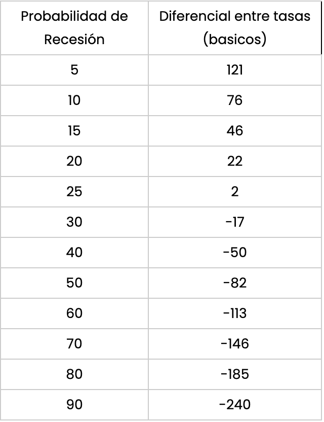 Tabla 1: probabilidad de recesión considerando diferencial de tasas 3 meses y 10 años.