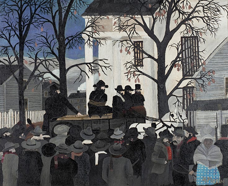Un buen ejemplo de este realismo "diferente" es la pintura John Brown Going to His Hanging. Brown fue un abolicionista radical durante las décadas previas a la Guerra Civil. Brown fue capturado, juzgado y ejecutado por la Commowealth de Virginia por "incursión e incitación a una rebelión de esclavos" en Harpers Ferry, Virginia, en 1859. Pippin relata este episodio con una pintura en su llamativo estilo.