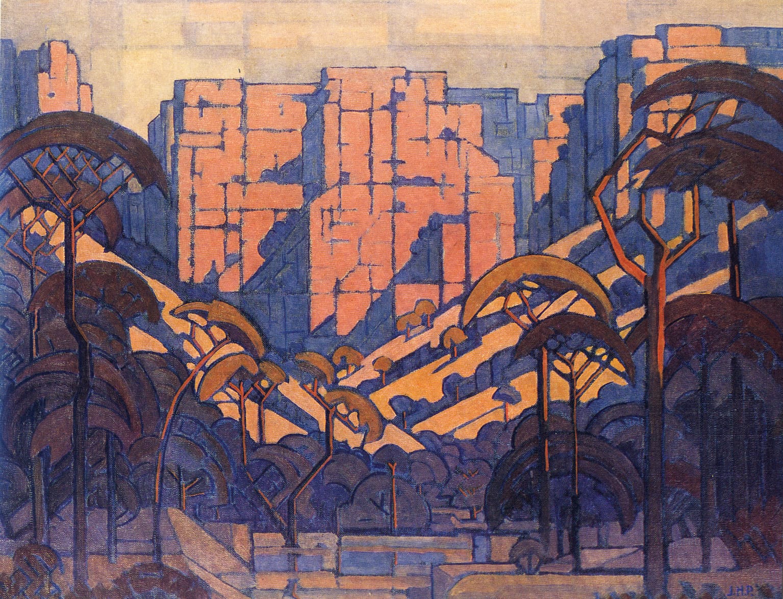 El mejor ejemplo –o por lo menos donde me queda muy claro a mí– es en los árboles. Pierneef primero hacía estudios detallados de algún tipo de árbol sudafricano, y uno esperaría que ese método produjera árboles casi realistas. Perp no, los árboles de JH tiene un aire incluso arquitectónico.
