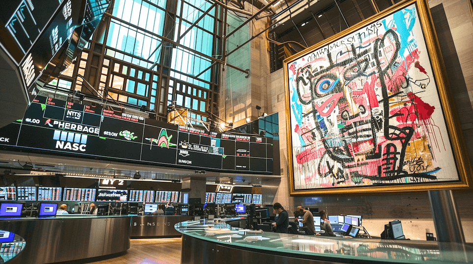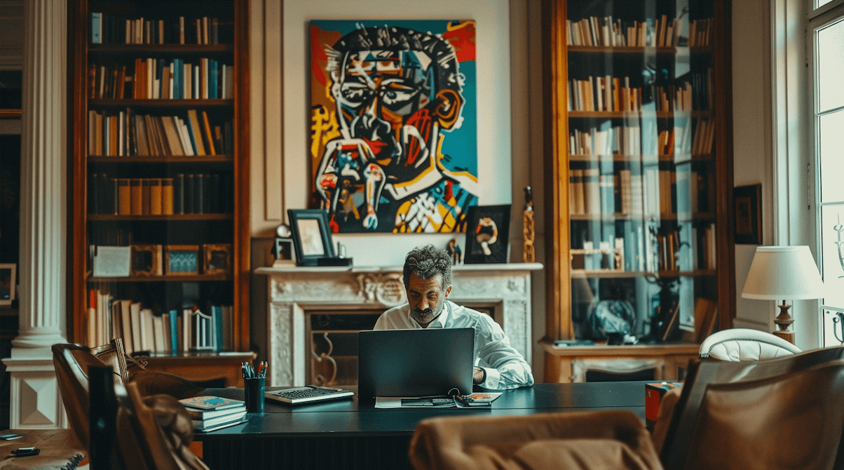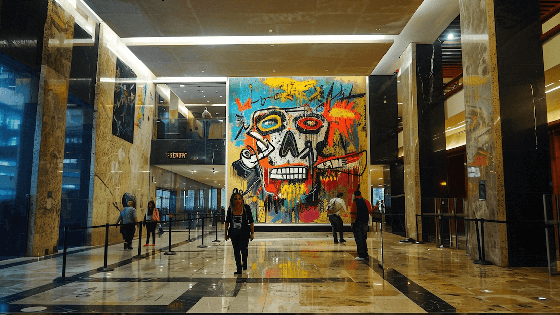 Replicar su arte con IA fue un desafío diferente: Midjourney entiende fácilmente su estilo, pero nos pareció más interesante situar sus cuadros en diferentes lugares: un estudio personal o dentro del edificio de Banxico.