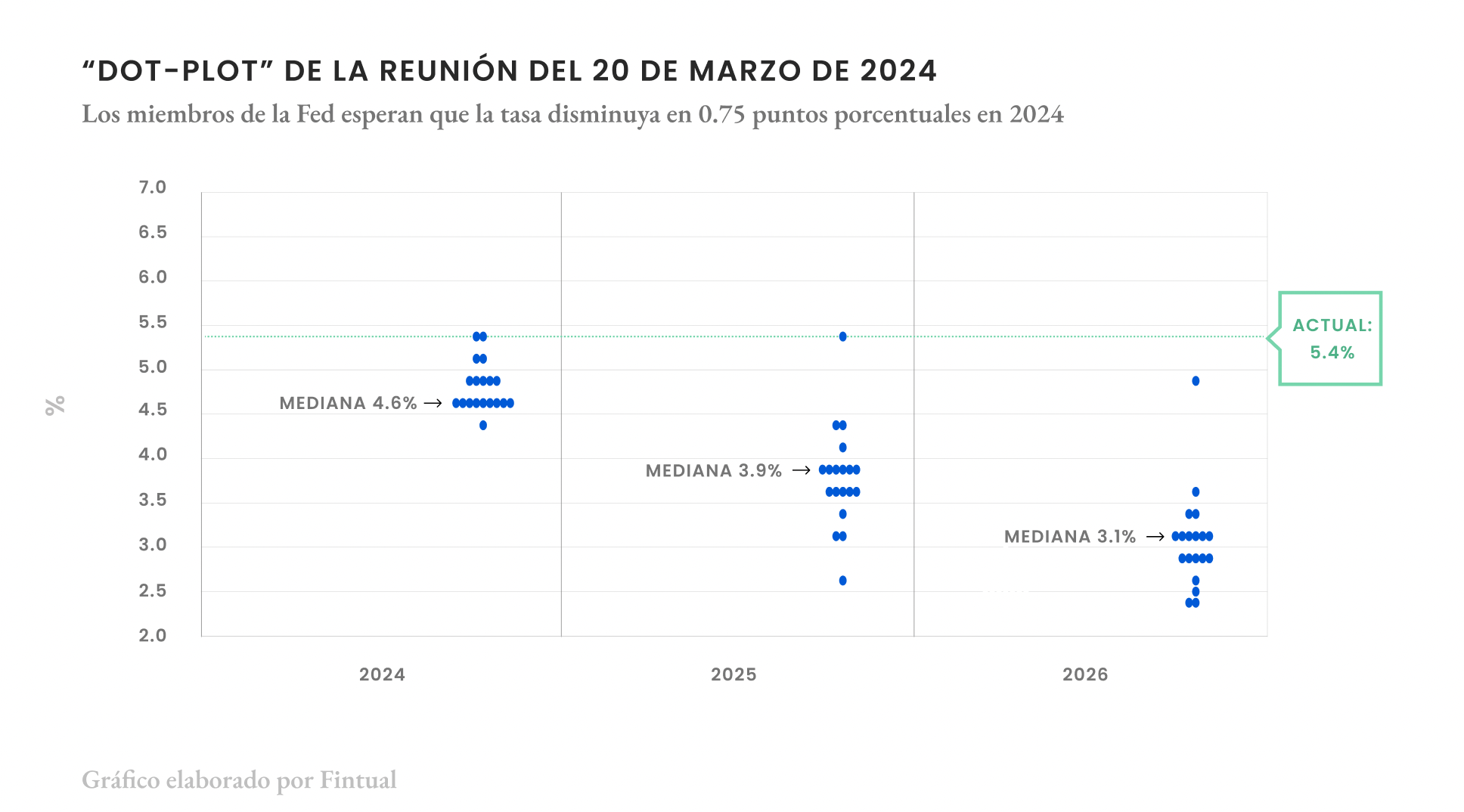 Aunque la proyección de inflación subyacente al cierre de 2024 subió un poco, de 2.4% a 2.6%, la mayoría de los miembros de la Fed todavía anticipan que habrá tres recortes de un cuarto de punto porcentual este año.