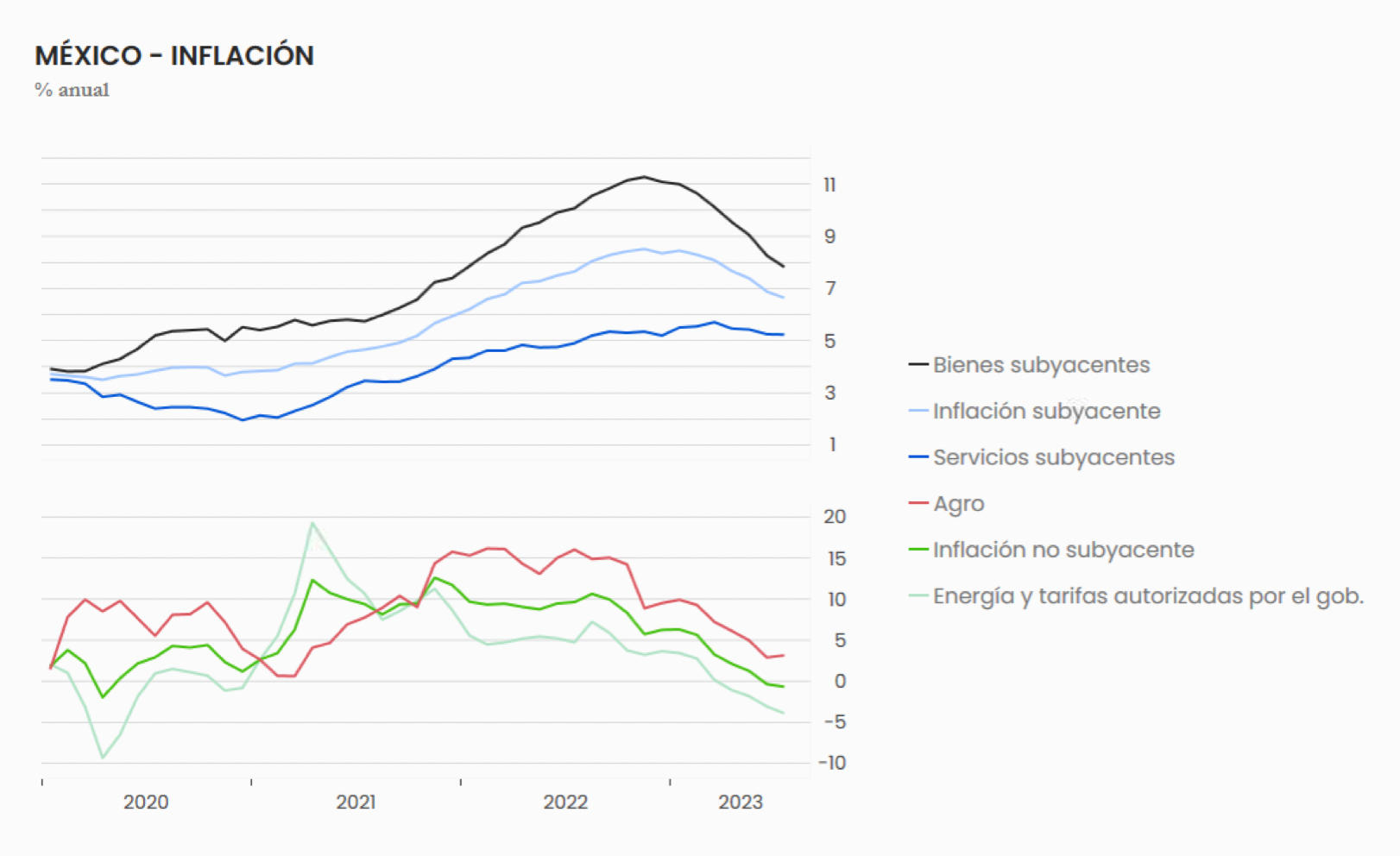 La inflación subyacente, aunque permanece en niveles muy altos, también siguió disminuyendo. Pasó de 6.89% a 6.64%. Es importante aclarar que sigue aumentando mes con mes a tasas atípicamente altas. Es decir, aunque hay progreso, las presiones inflacionarias no se han resuelto por completo. En términos generales los datos están en línea con las proyecciones de Banxico.