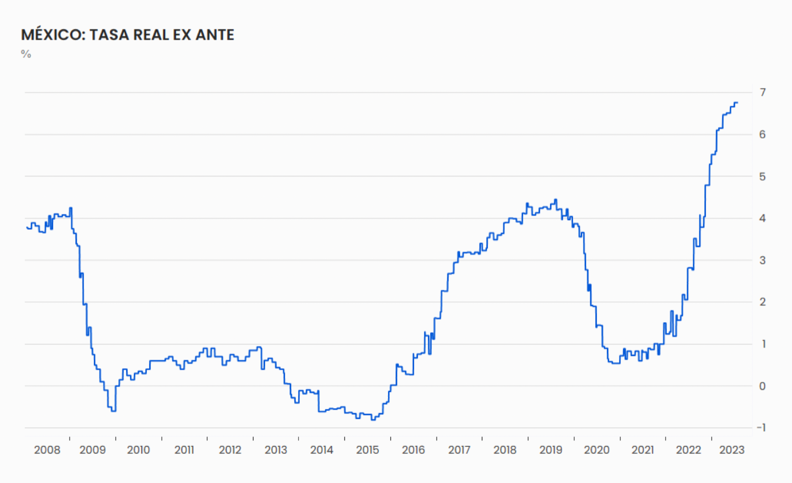 Creemos que aún no se puede descartar un recorte marginal de la tasa a finales de año, especialmente si la Fed no vuelve a subir su tasa. Hay que tener en cuenta que a medida que las expectativas de inflación siguen disminuyendo, el nivel de restricción monetaria aumenta. La tasa de interés real, es decir, ajustada por expectativas de inflación, ha seguido aumentando y ya llegó a cerca de 6.8%, Al menos un miembro de Banxico ha expresado que un nivel por sobre 7% sería muy restrictivo.