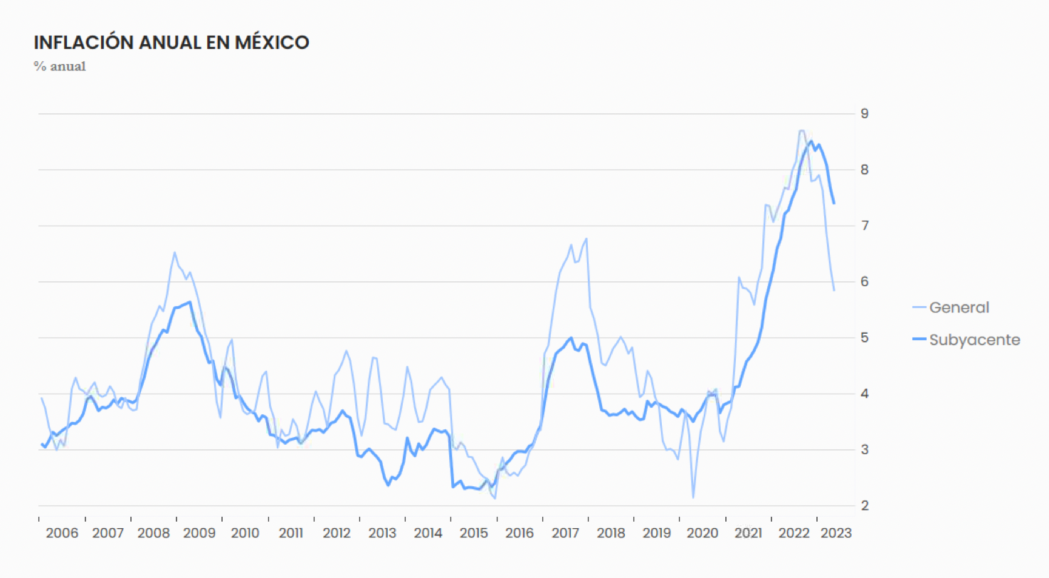 En México la inflación de mayo se publicó el jueves. Se desaceleró de 6.3% a 5.8%, bien en línea con las expectativas. Lo que está permitiendo que la inflación baje es la parte más volátil de la inflación, alimentos y energéticos. Mientras tanto, la inflación de los servicios todavía no ha bajado. Sin embargo, ya los avances mensuales de los precios de los ítems menos volátiles están más en línea con rangos normales, lo cual es buena noticia.