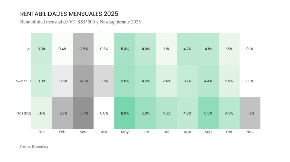 Noviembre fue un mes de rendimientos negativos para los principales índices accionarios, aunque dentro de un año de rendimientos muy buenos.
