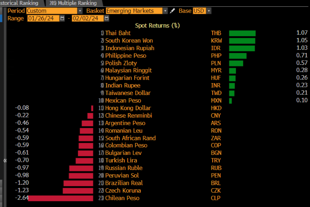 El miércoles se publicó la decisión de política monetaria en Estados Unidos. Como era ampliamente esperado, la Fed mantuvo la tasa sin cambios en el actual rango de 5.25-5.50%. Sin embargo, la Fed dejó claro que no está lista para comenzar a recortar sus tasas, porque necesita mayor evidencia de que la inflación seguirá bajando para converger de forma sostenida a la meta del 2%. De hecho, dijo claramente que no espera comenzar a recortar en marzo, como una parte del mercado esperaba. Esto tuvo un impacto negativo en los activos.