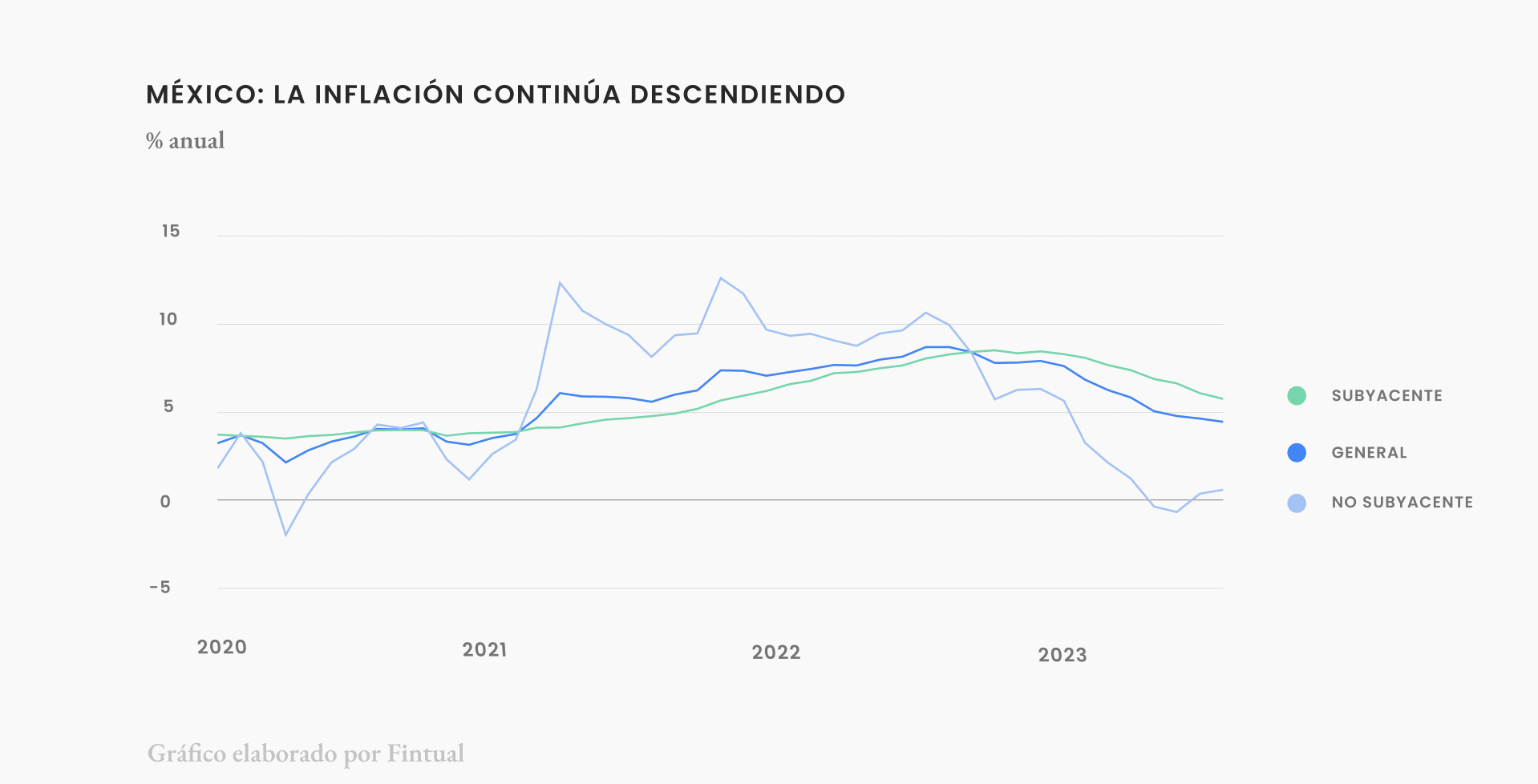 En términos anuales, la inflación siguió descendiendo. De 4.64% a 4.45% la general y de 6.08% a 5.76% la subyacente. Es una muy buena noticia que la inflación continúe su curso. Sin embargo, es importante recalcar que muy probablemente la caída será mucho más gradual de ahora en adelante.