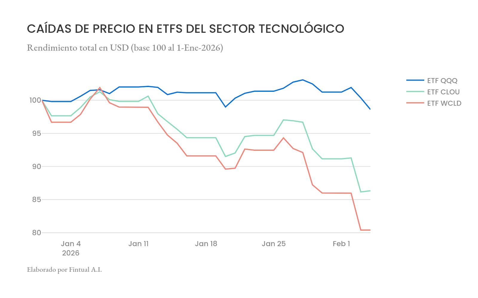 Y con eso también se arrastraron otras compañías tecnológicas, sin que necesariamente calcen con la narrativa del “SaaSpocalypse”, como grandes tecnológicas, tecnológicas de consumo o incluso compañías de semiconductores como Nvidia: el Nasdaq-100 tuvo su peor pérdida de dos días desde octubre, borrando más de 550 mil millones de dólares en valor de mercado.