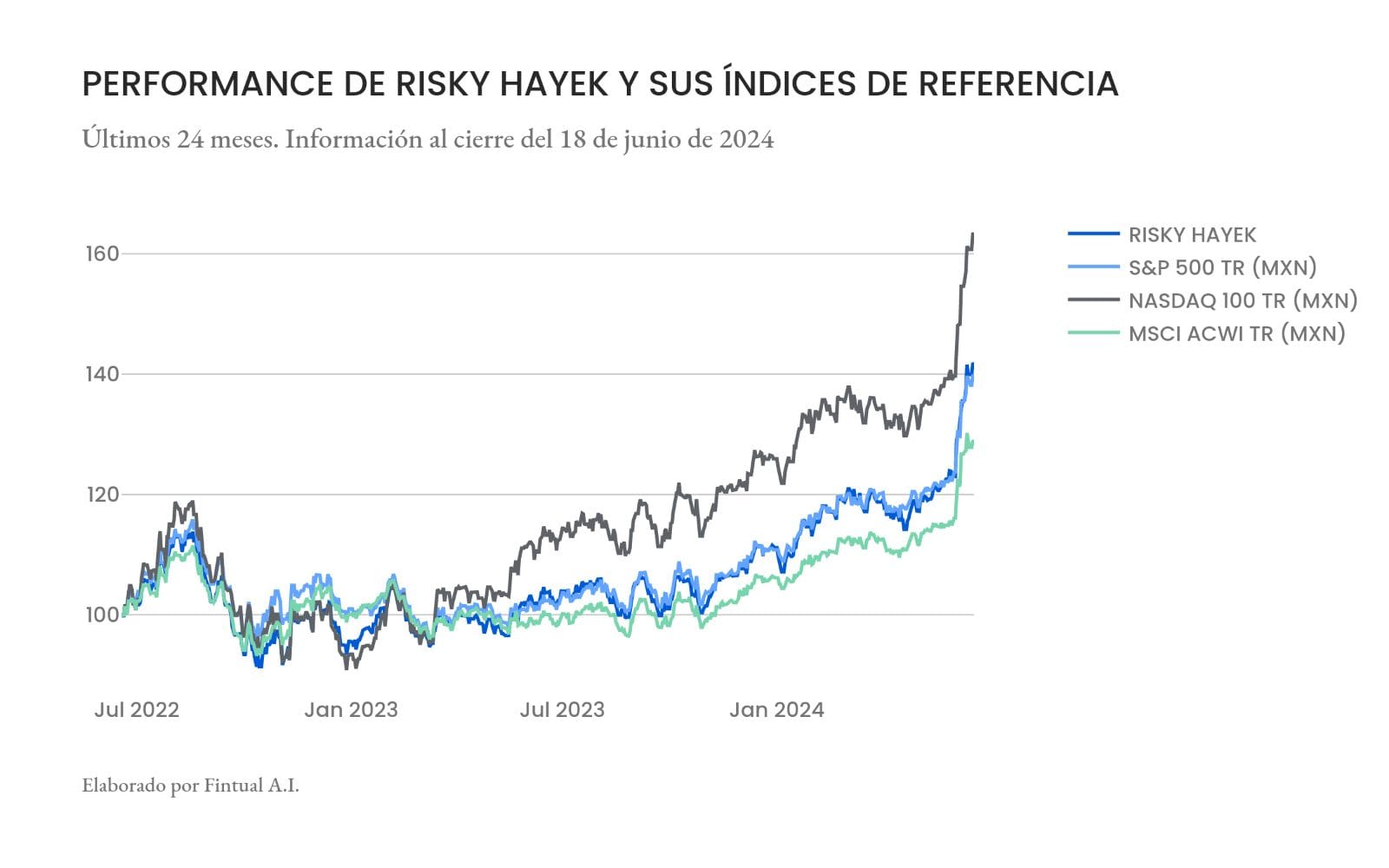 De hecho, tan sólo en lo que va de 2024, Risky Hayek ha subido más de 27%, comparado con el 5.2% que han subido los CETES.