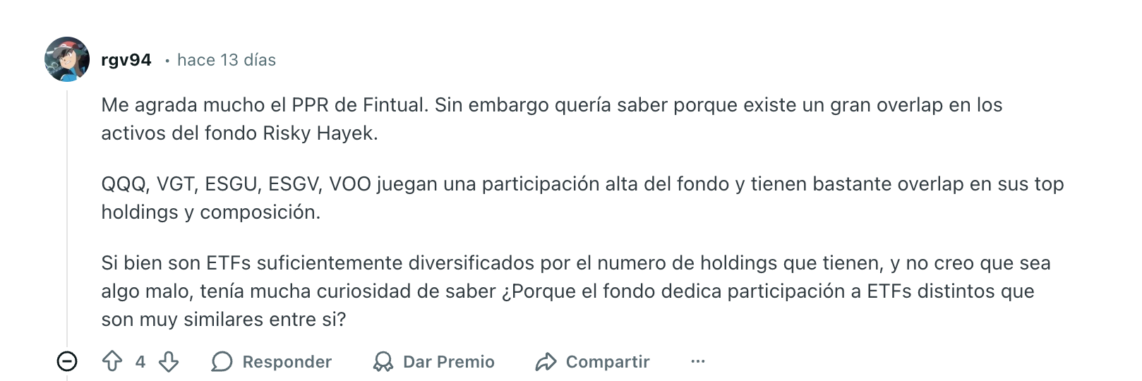 Es totalmente normal que haya overlap entre los ETFs que componen un fondo amplio de acciones globales como Risky Hayek. Muchos ETFs amplios (como QQQ, VGT o ESGV) incluyen acciones similares (Apple, Microsoft, Google, etc.) porque todos buscan exposición a índices amplios o sectores relevantes globales, y entonces esas acciones pueden aparecer varias veces.