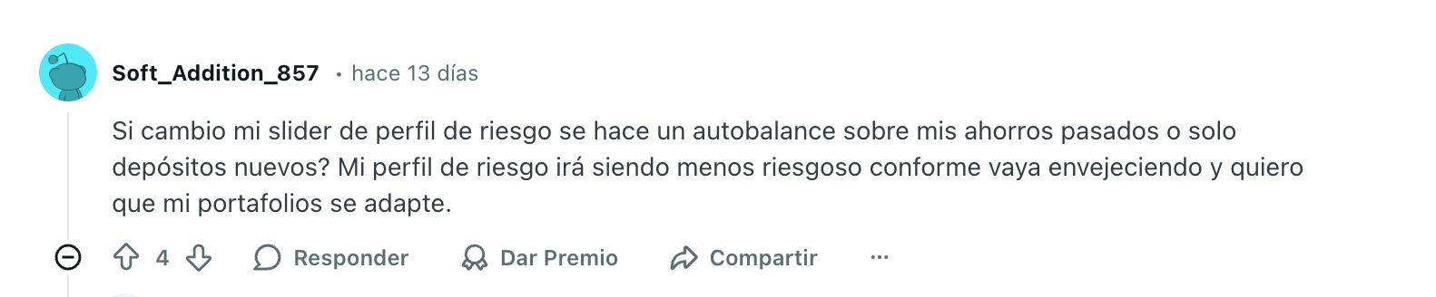 Y para otros objetivos (no PPR): Si quieres que tus ahorros pasados se adapten al nuevo perfil de riesgo, puedes crear un nuevo objetivo con el riesgo deseado y mover tus fondos al nuevo objetivo. Esto permite que todo tu portafolio se ajuste al nuevo nivel de riesgo.