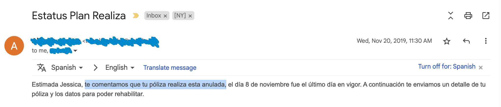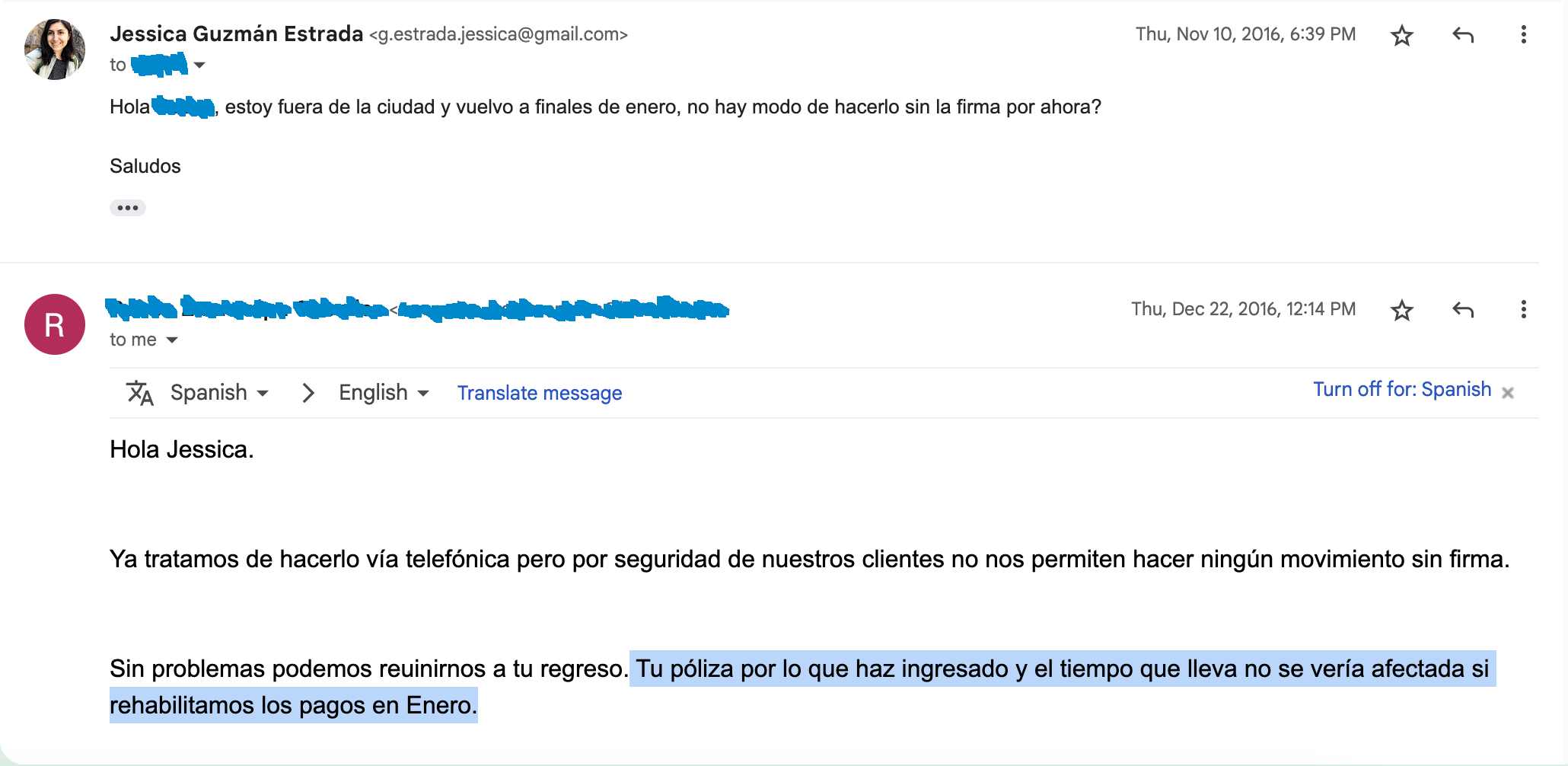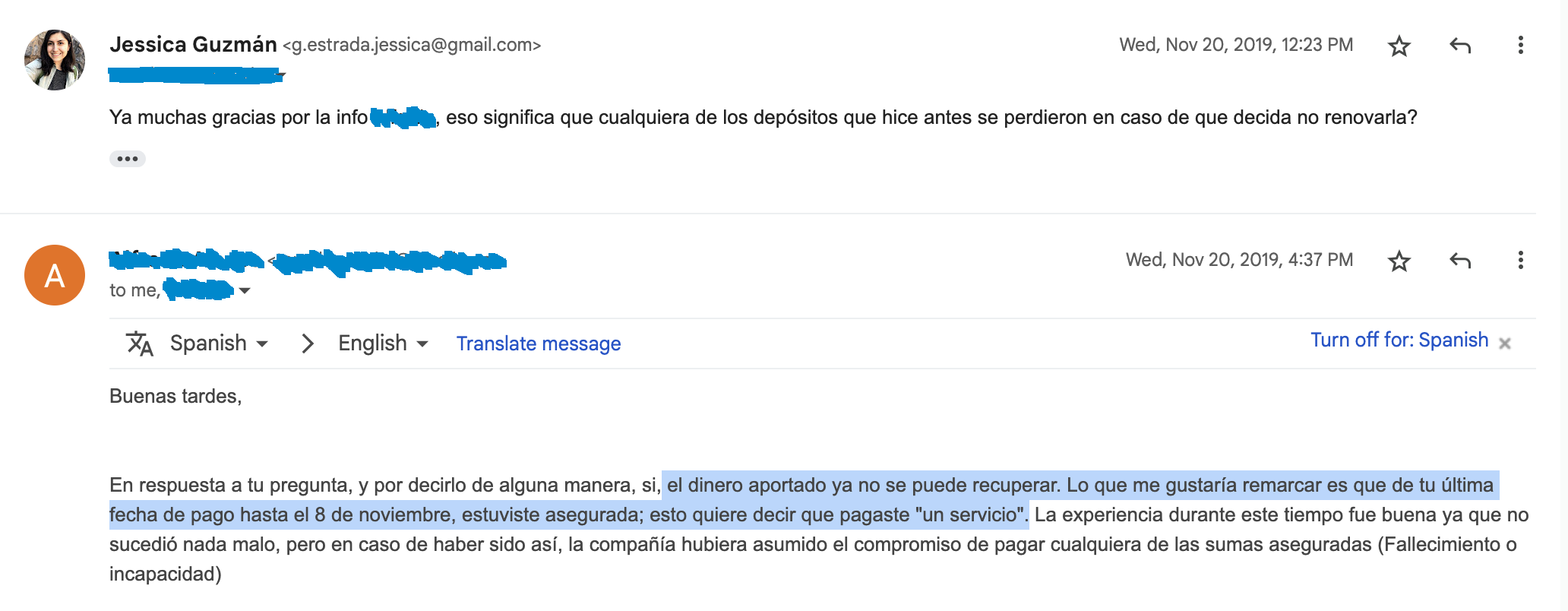 Un día decidí poner en orden mis finanzas y preguntar el estatus de mi ahorro y cómo me podía regularizar. Me dijeron que mi póliza estaba anulada, ya que básicamente todo lo que había ahorrado se había utilizado para cubrir la póliza del seguro que venía ligado a mi inversión.