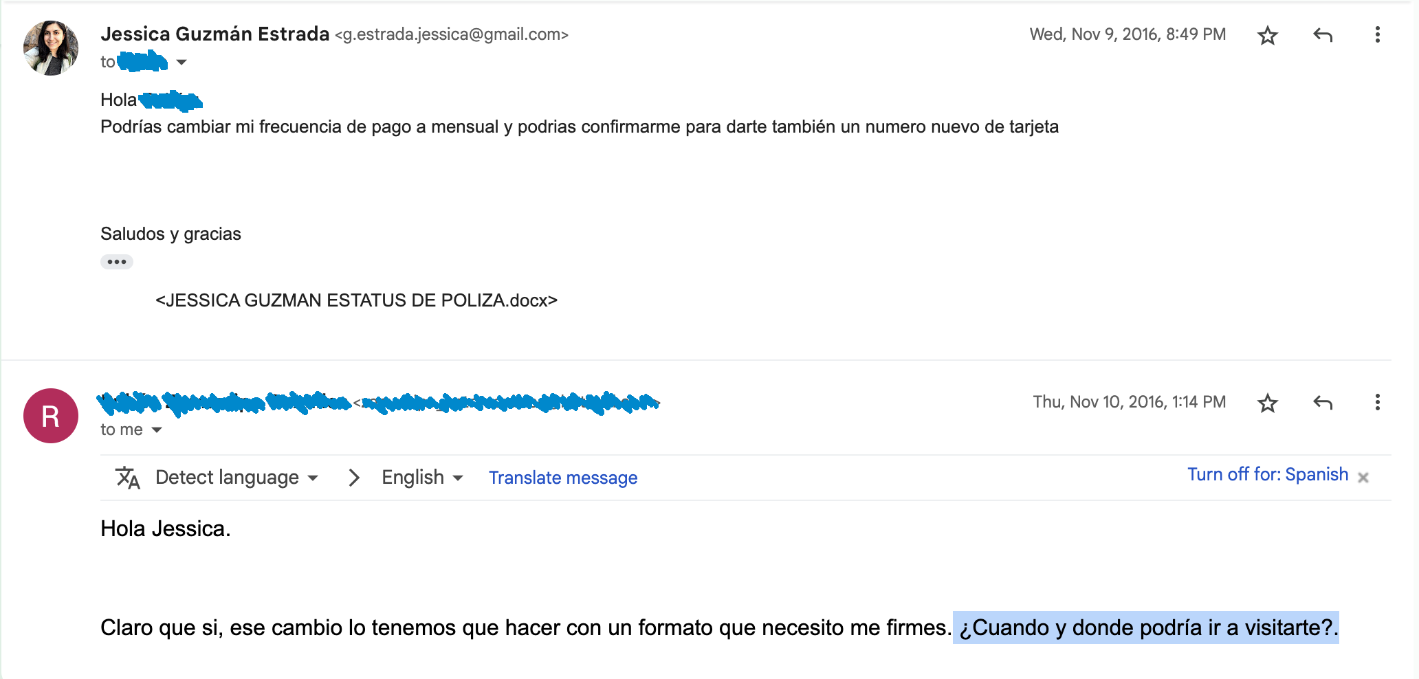 Pasó un año, y por primera vez después de esa reunión, se comunicaron conmigo para ver cómo iba a renovar mis pagos. Pero yo estaba por unos meses fuera de la ciudad, mi tarjeta se me había perdido en el viaje, y entonces necesitaba pagar mes a mes mi ahorro. Para poder hacer estos cambios, me pedían que nos reuniéramos de nuevo.