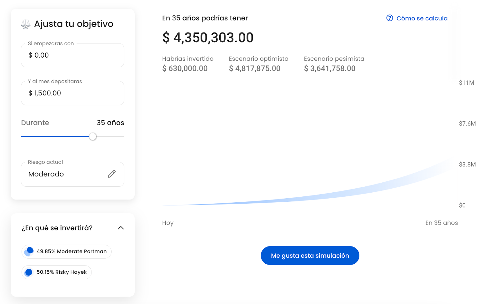 Imagina a una persona con 30 años. De acuerdo con nuestro simulador, aportando $1,500 al mes en su PPR con un riesgo moderado, podría obtener un estimado de 4.35 millones de pesos al momento de su retiro (65 años).